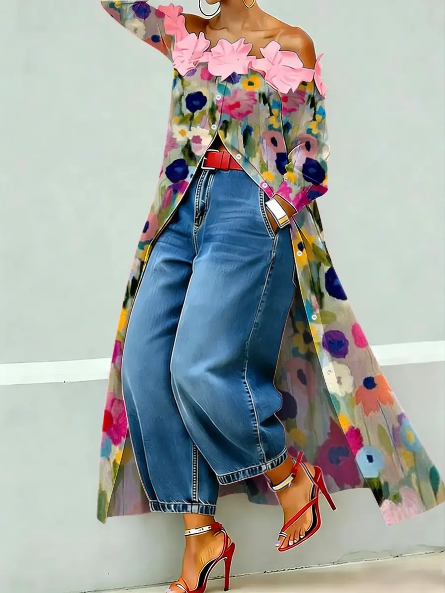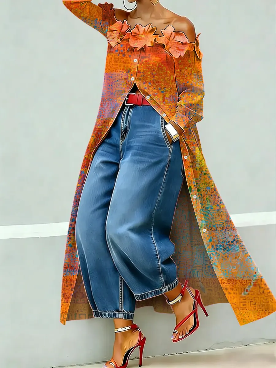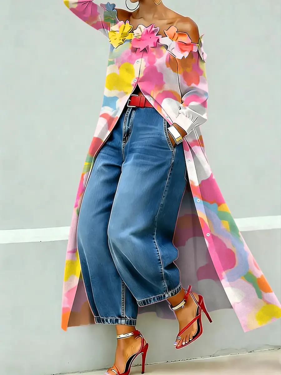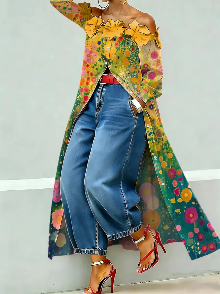 Women's Abstract Flowers Art Print Off-shoulder Long-sleeved Shirt