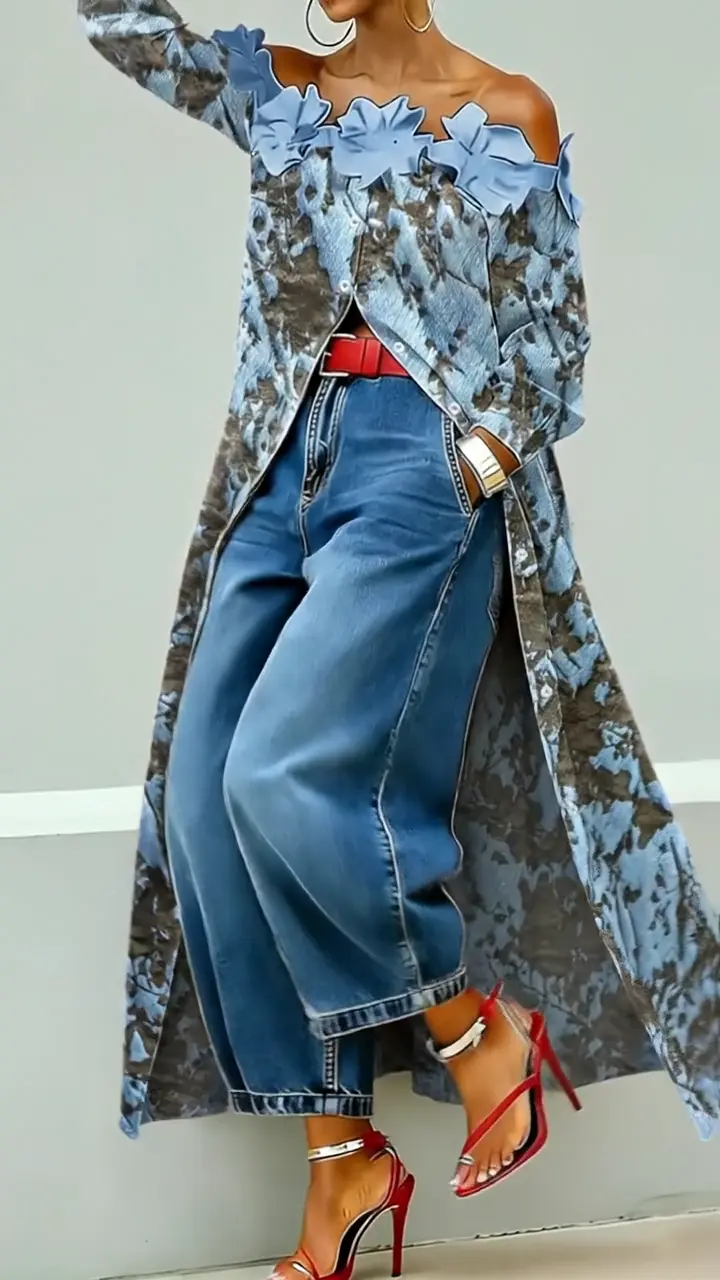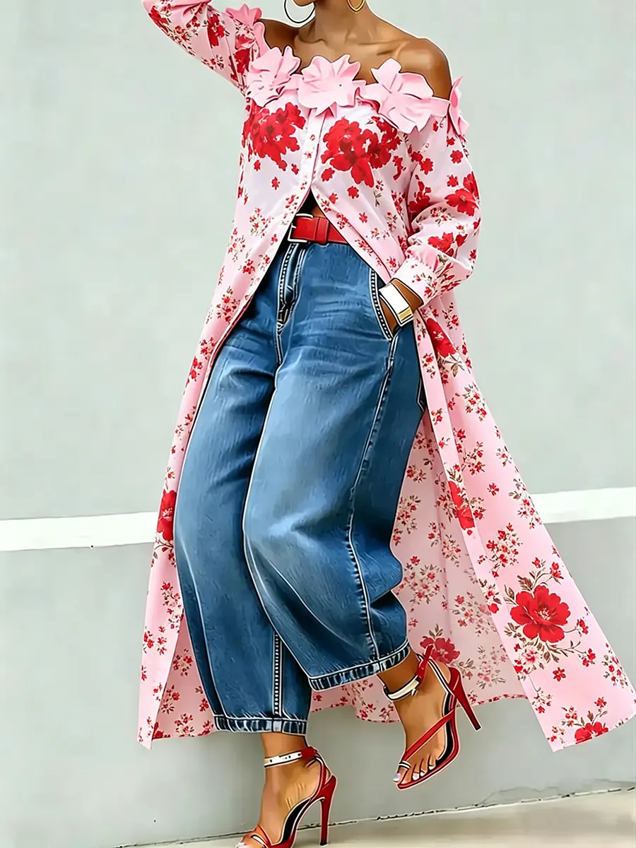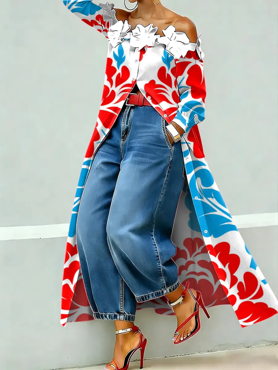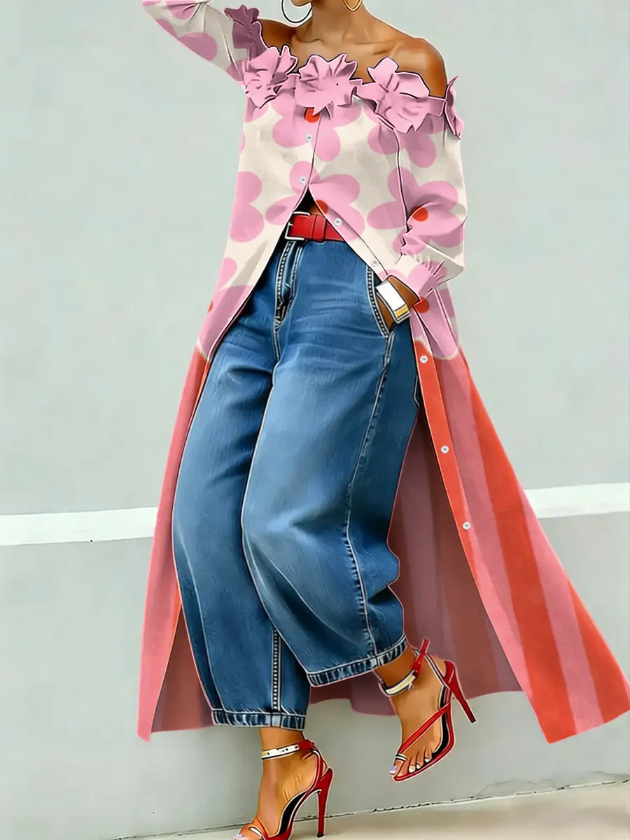 Women's Abstract Flowers Art Print Off-shoulder Long-sleeved Shirt