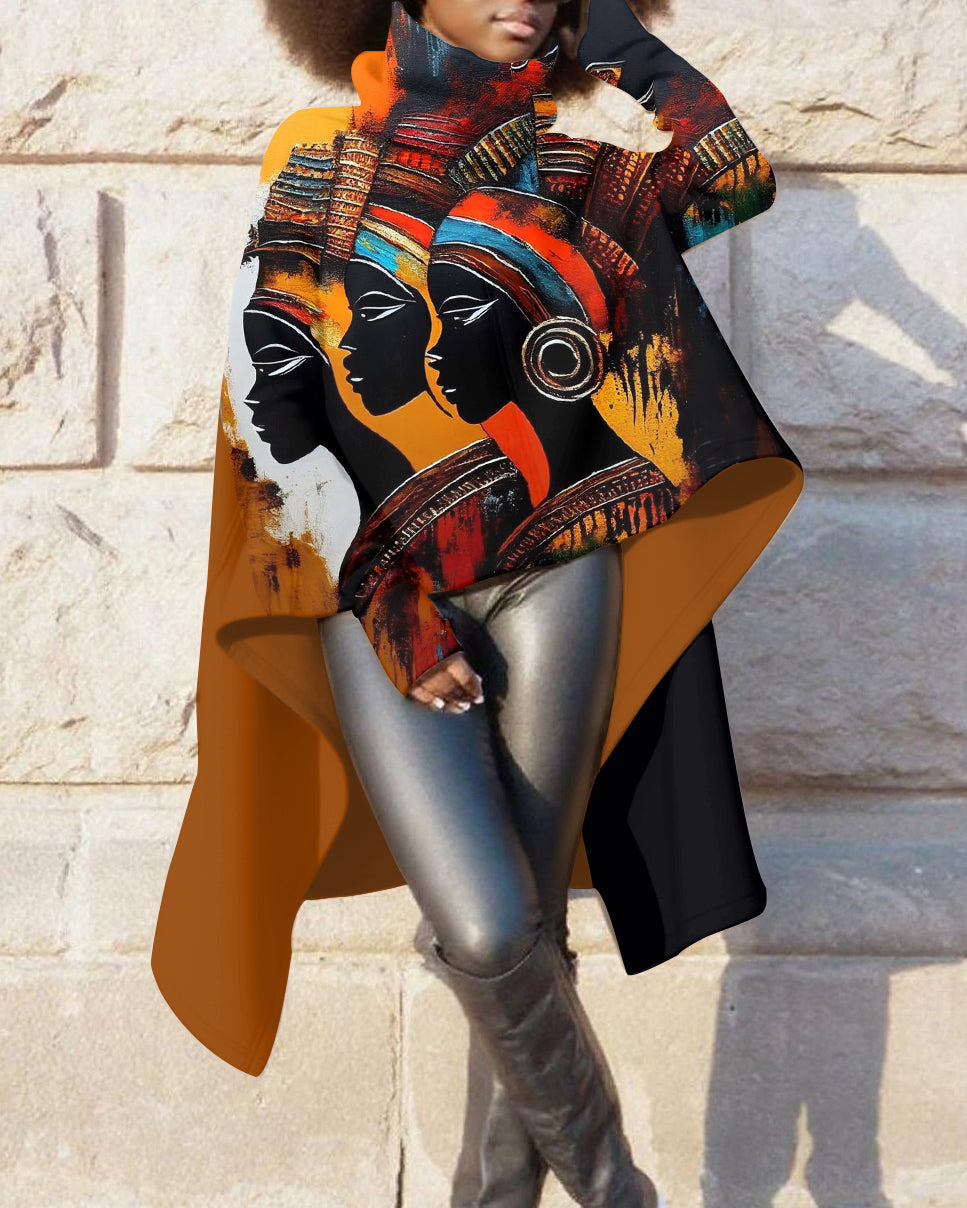 High Collar Pullover African Tribal Women Irregular Long Sleeve Warm Sweatshirt