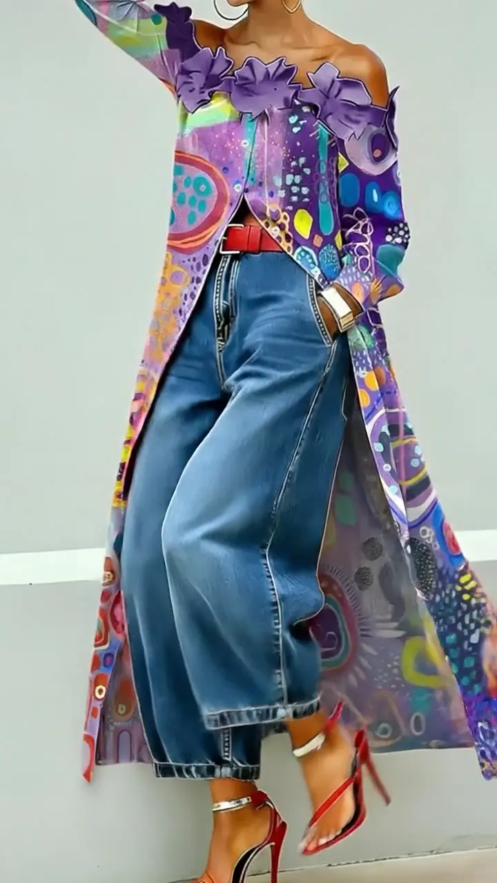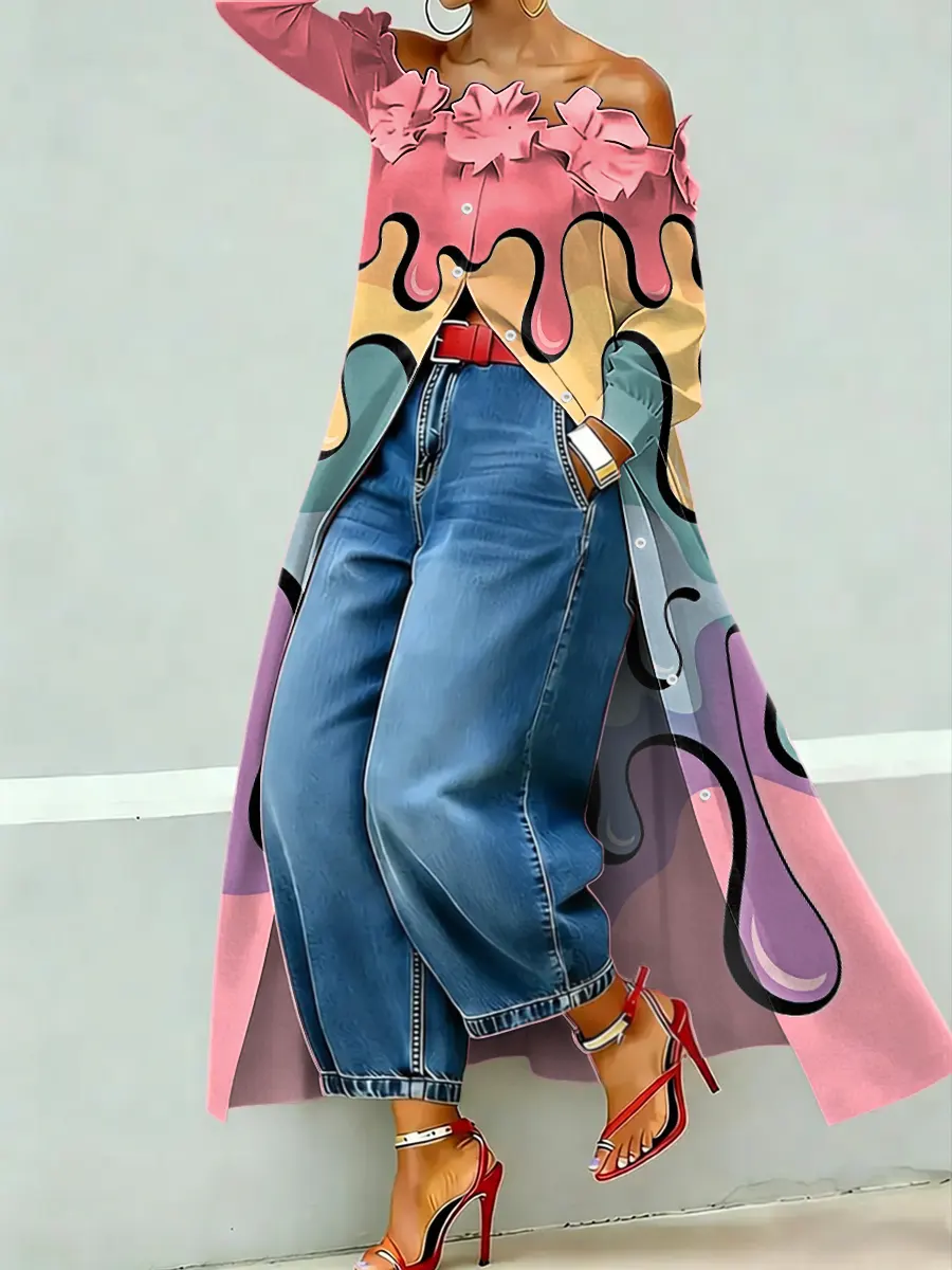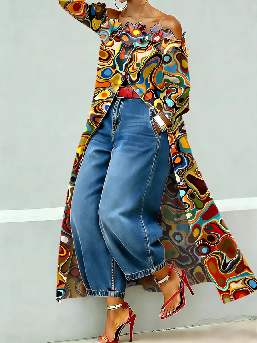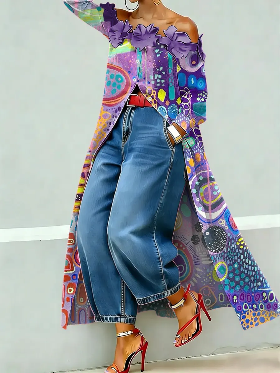 Women's Abstract Art Print Off-shoulder Long-sleeved Shirt