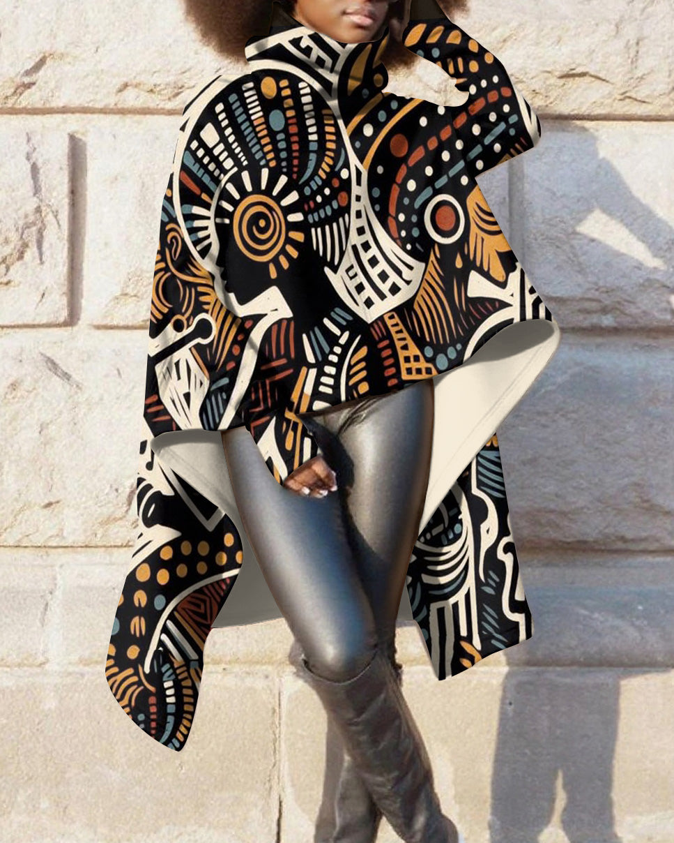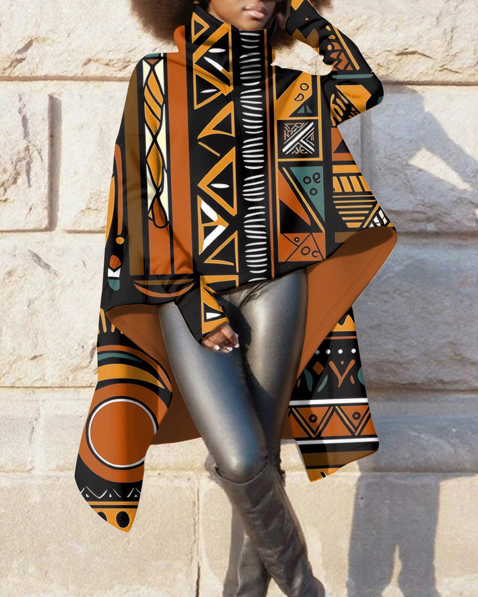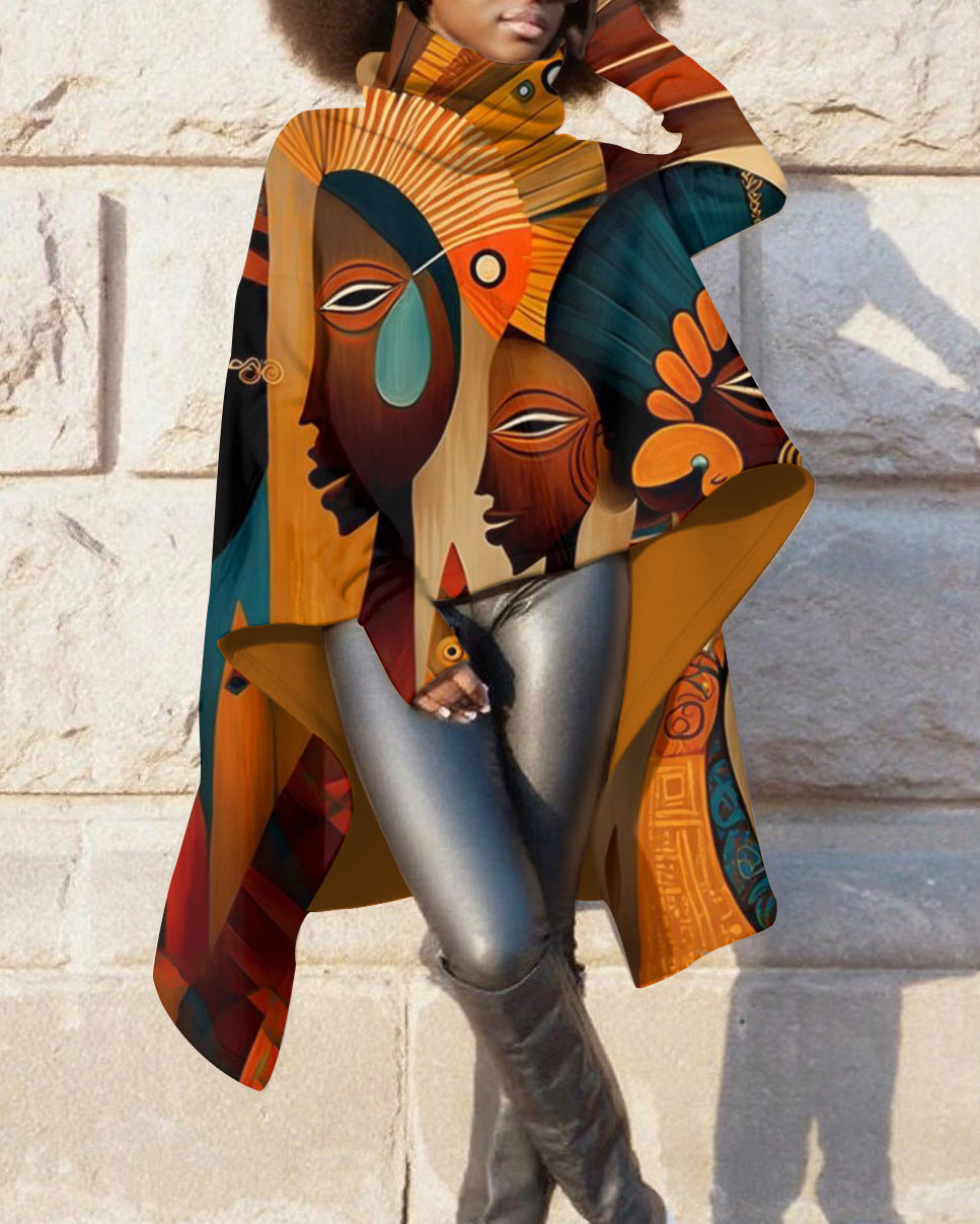 High Collar Pullover African Tribal Pattern Irregular Long Sleeve Warm Sweatshirt