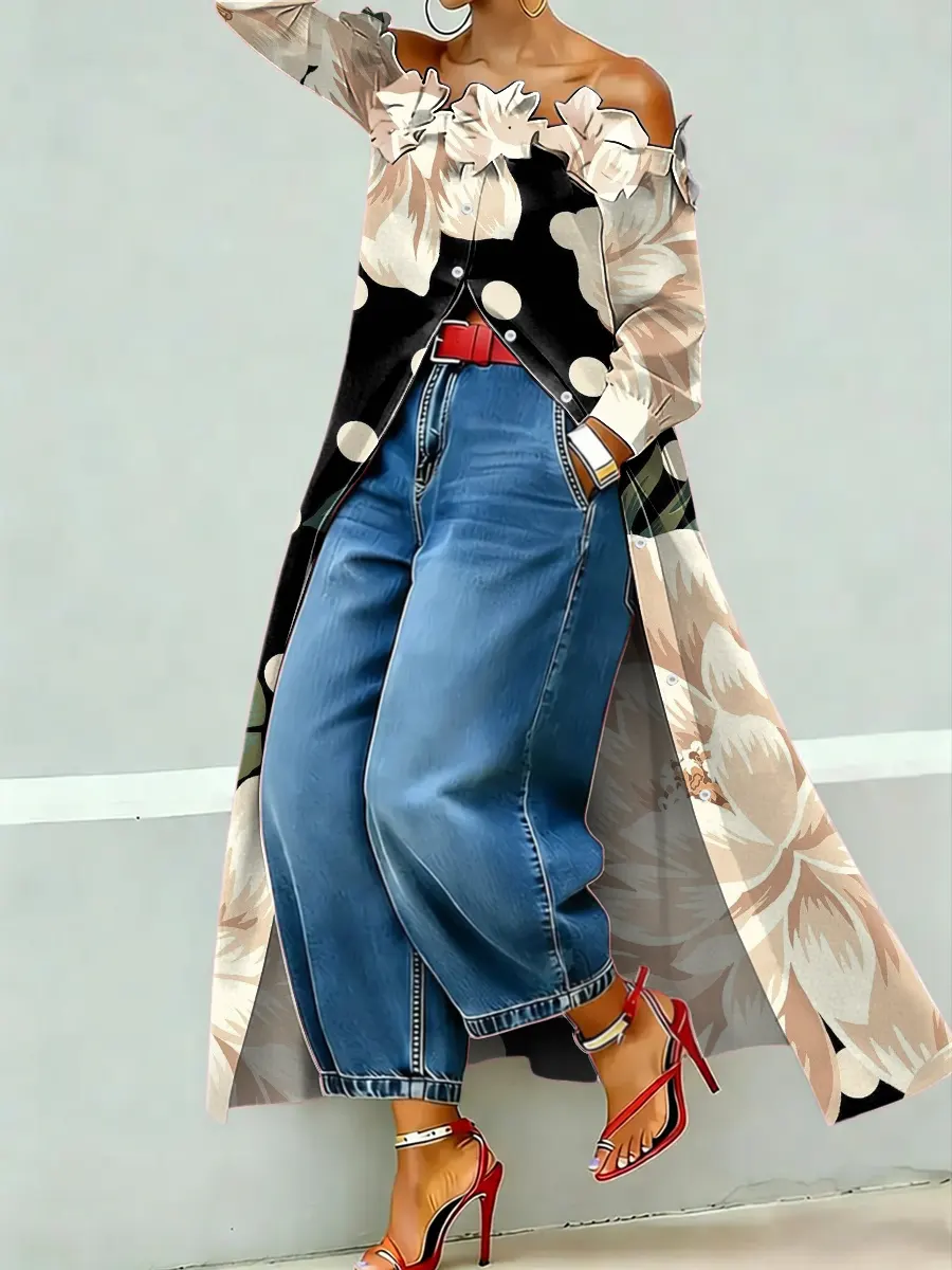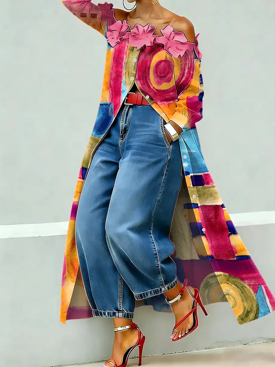 Women's Retro Abstract Art Print Off-shoulder Long-sleeved Shirt Dress
