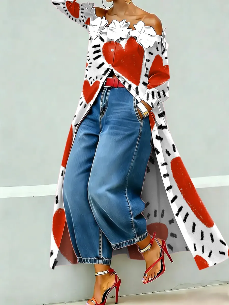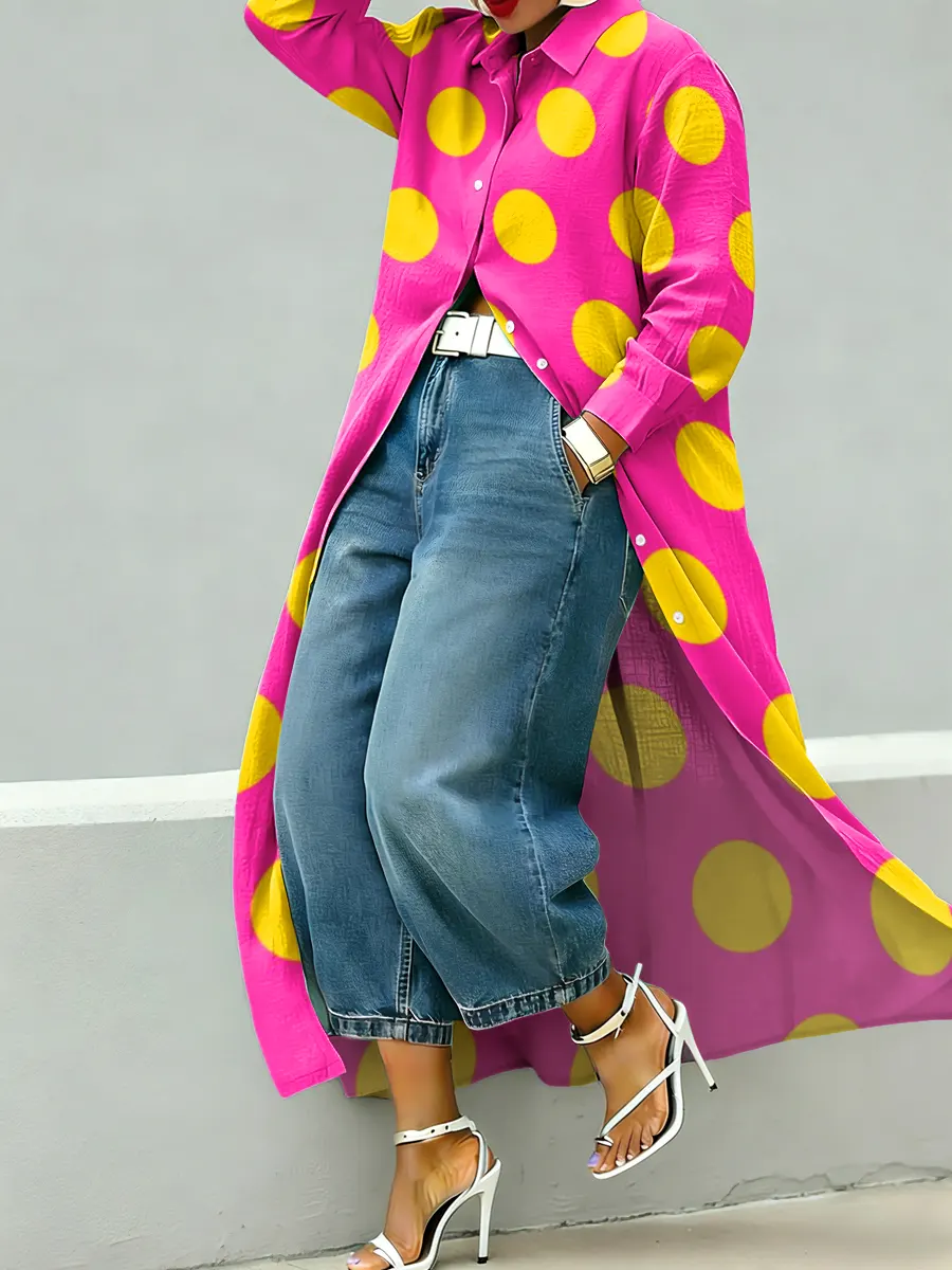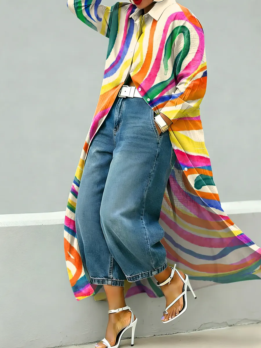 Women's Abstract Art Prints Long-sleeve Lapel Long Shirt Dress