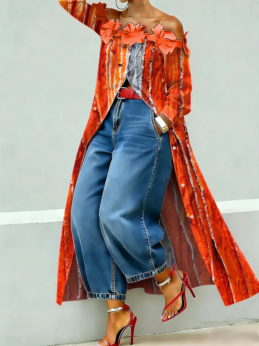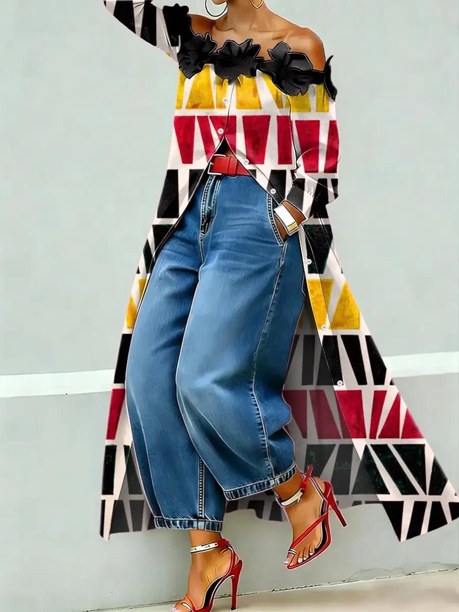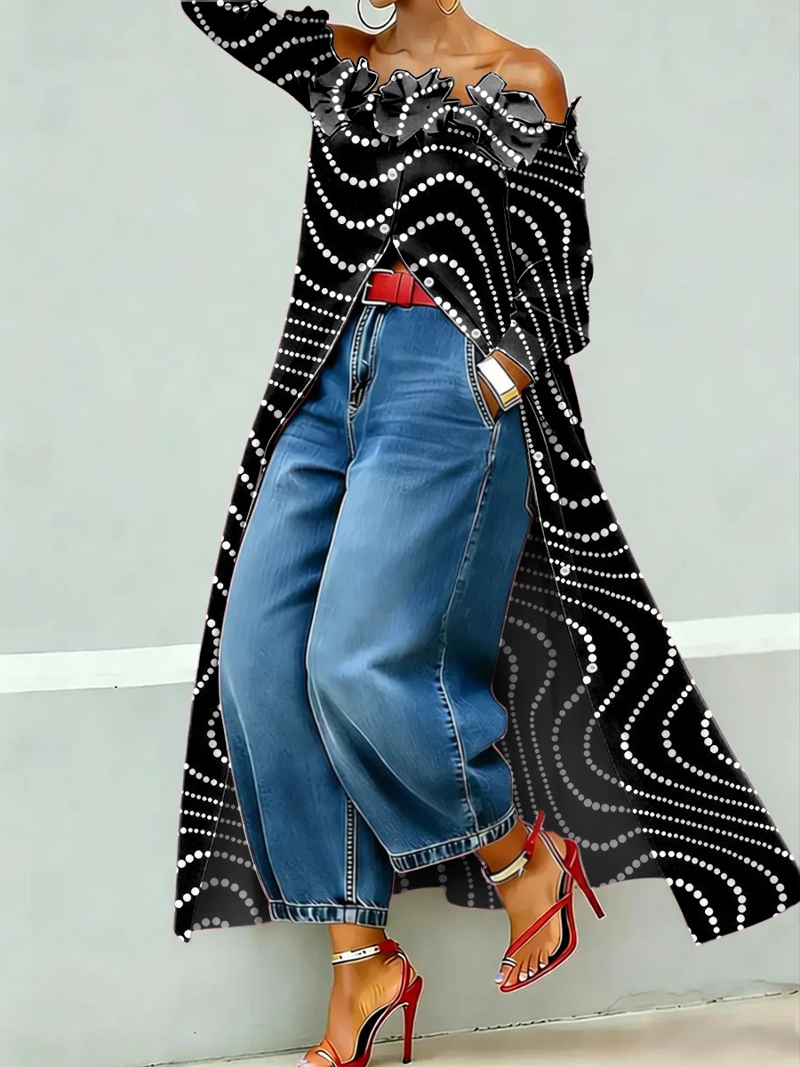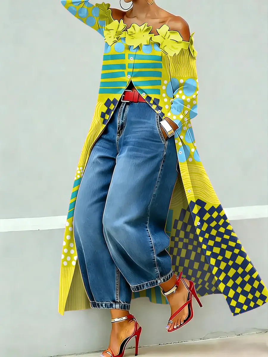 Women's Fashionable Retro Geometric Stripes Art Print Off-shoulder Long-sleeved Shirt Dress