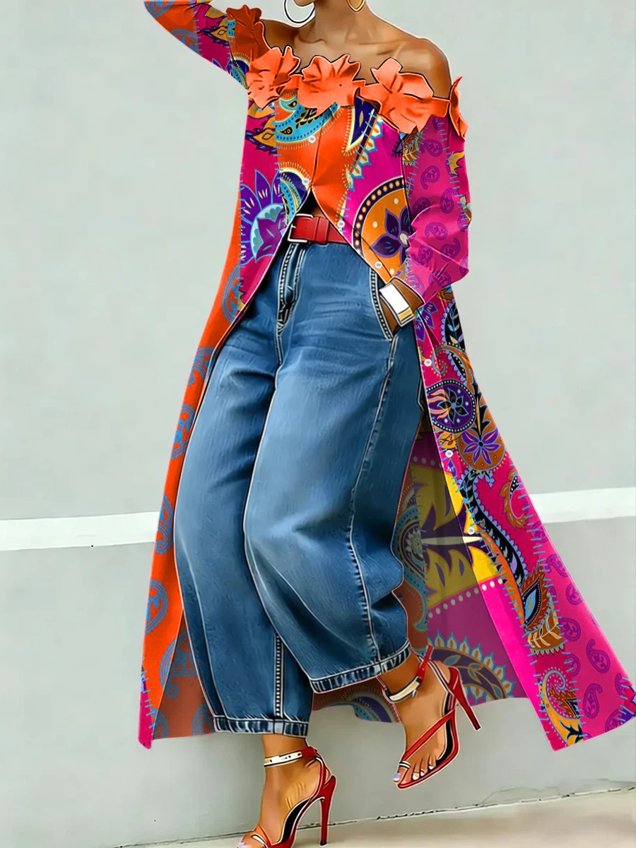 Women's Fashionable Paisley Art Print Off-shoulder Long-sleeved Shirt Dress