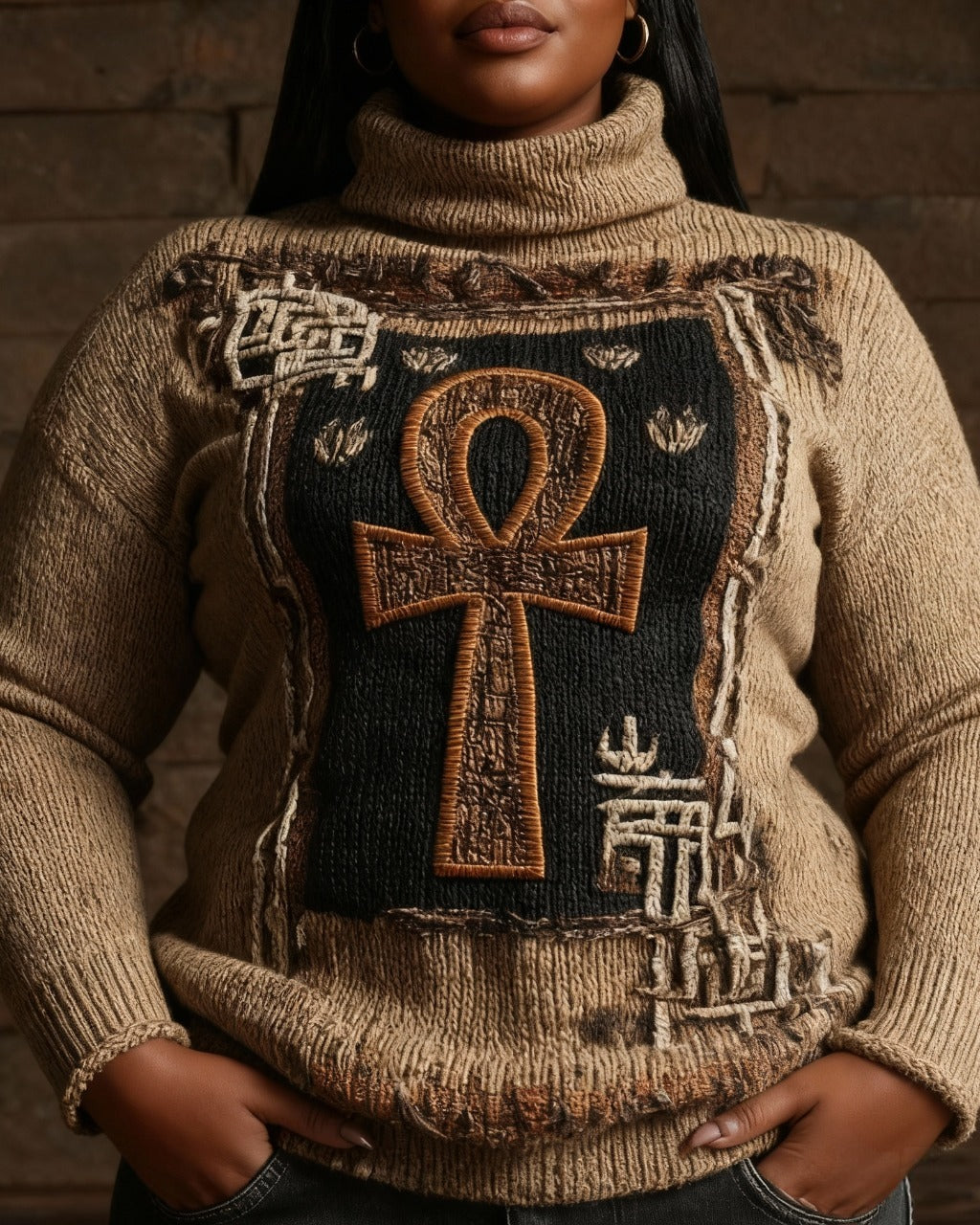 Egyptian Totem Cross Turtleneck Long-sleeved Knit Sweater