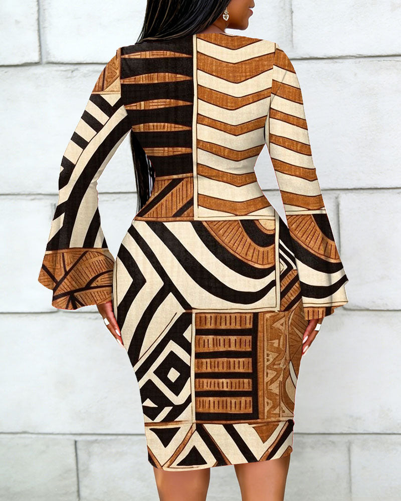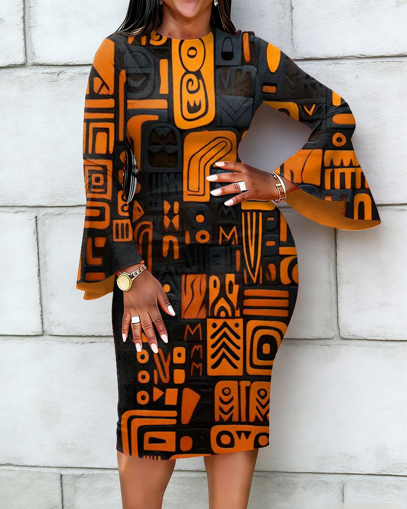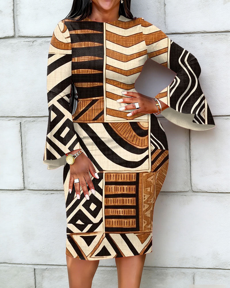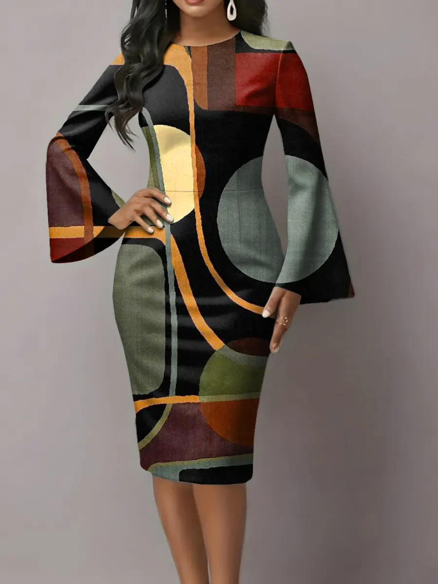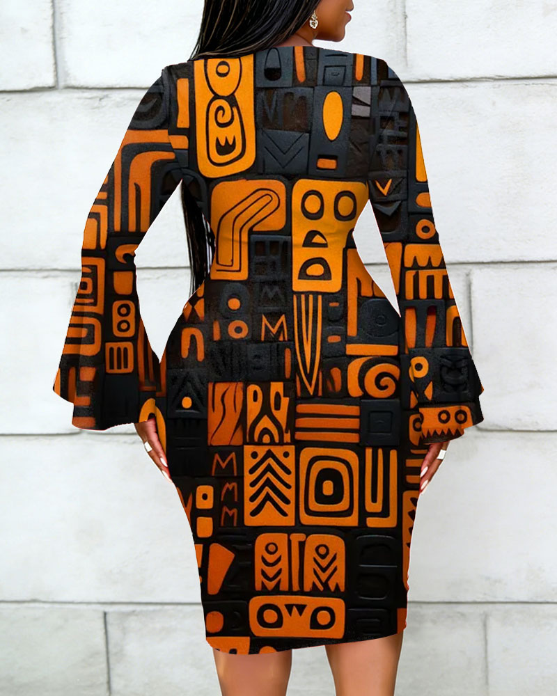 Women's Retro Abstract Geometric Art Print Flared Sleeves Midi Bodycon Dresses
