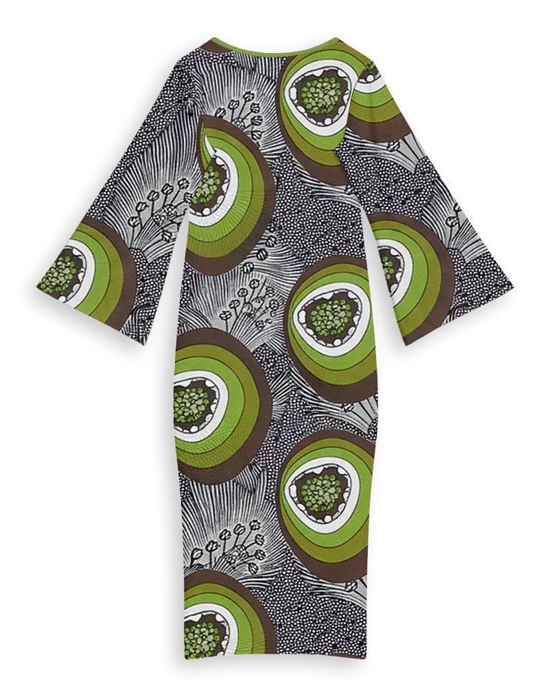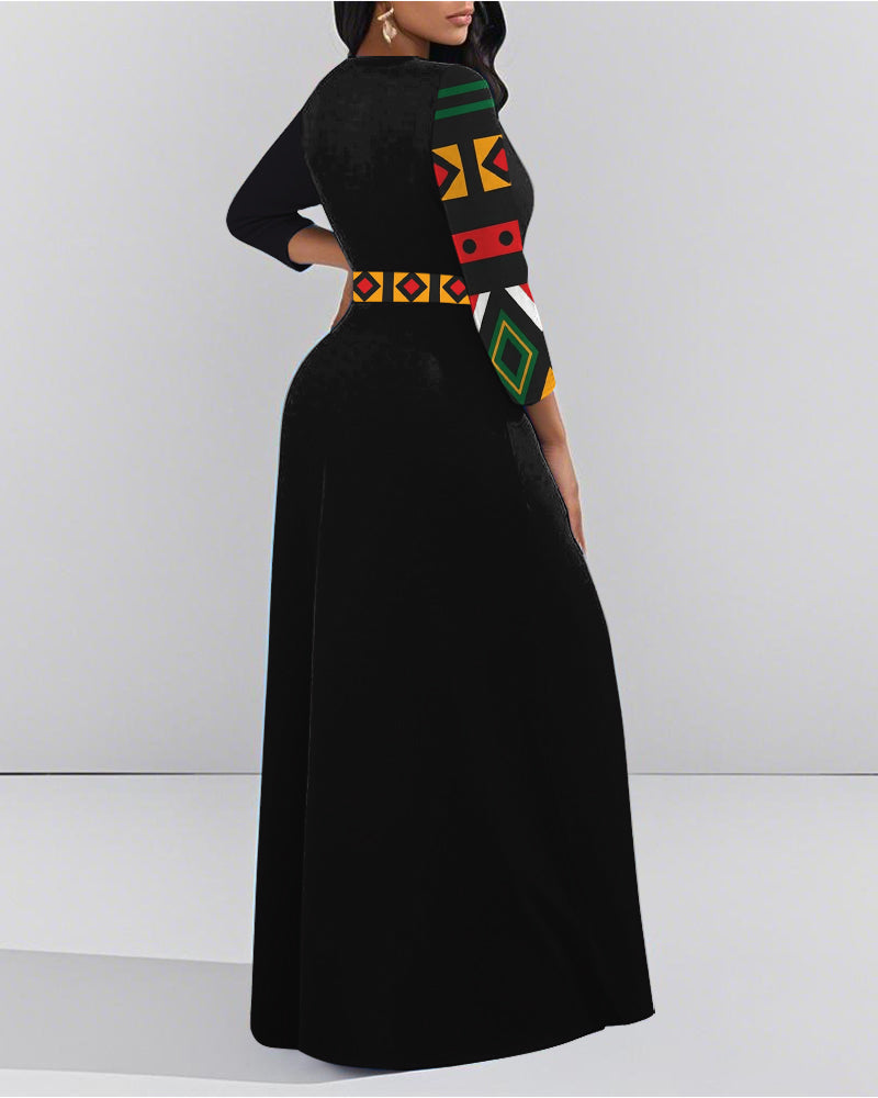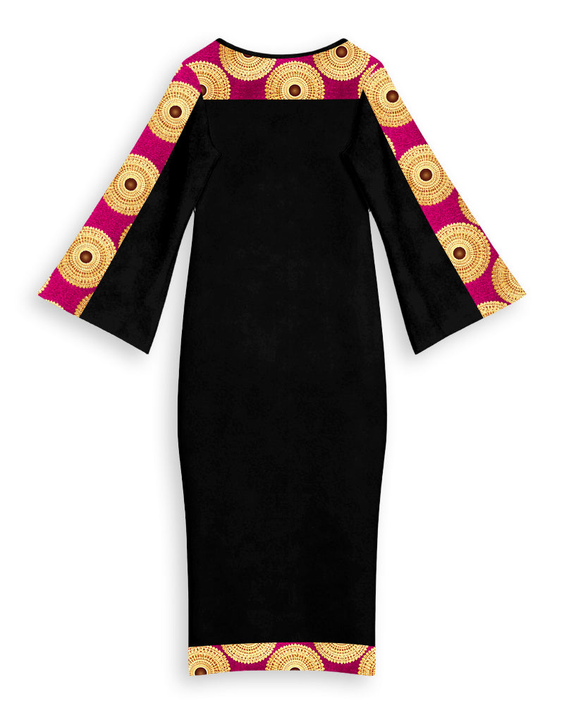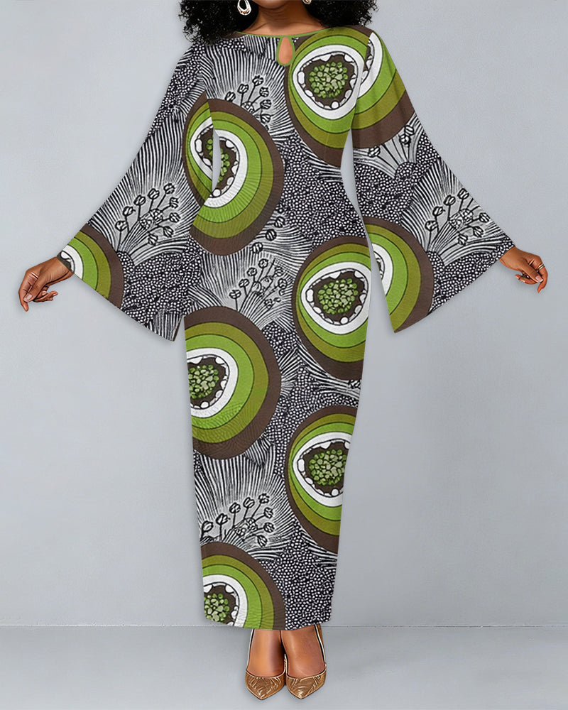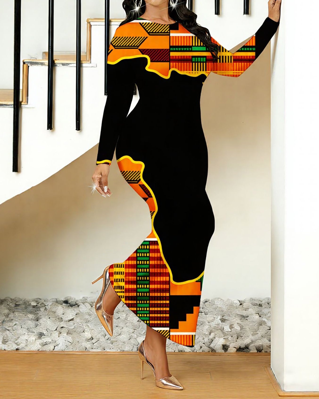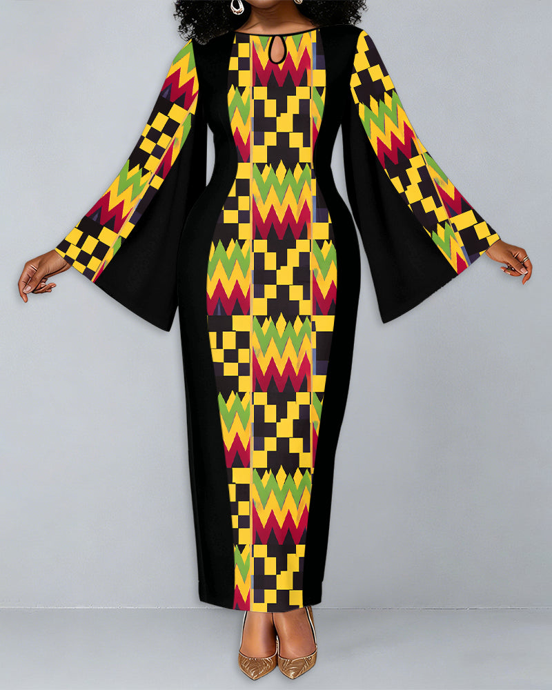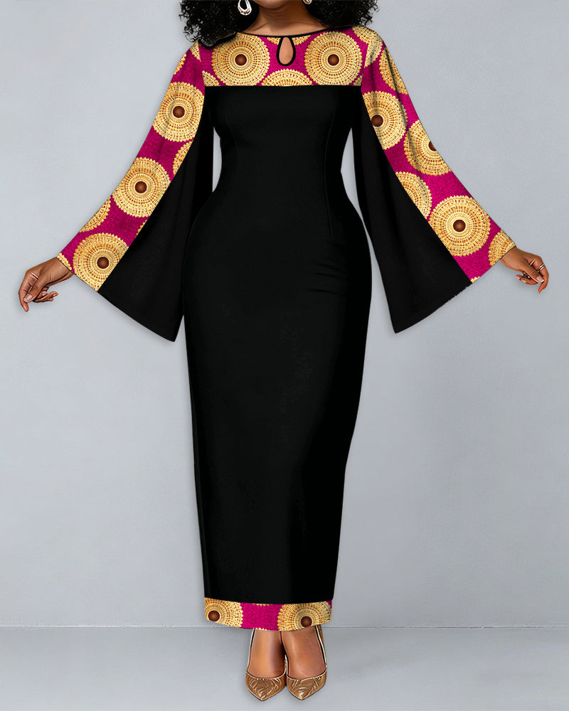 Ankara African American Culture Print Patchwork Round Neck Bell Sleeve Bodycon Long Dress