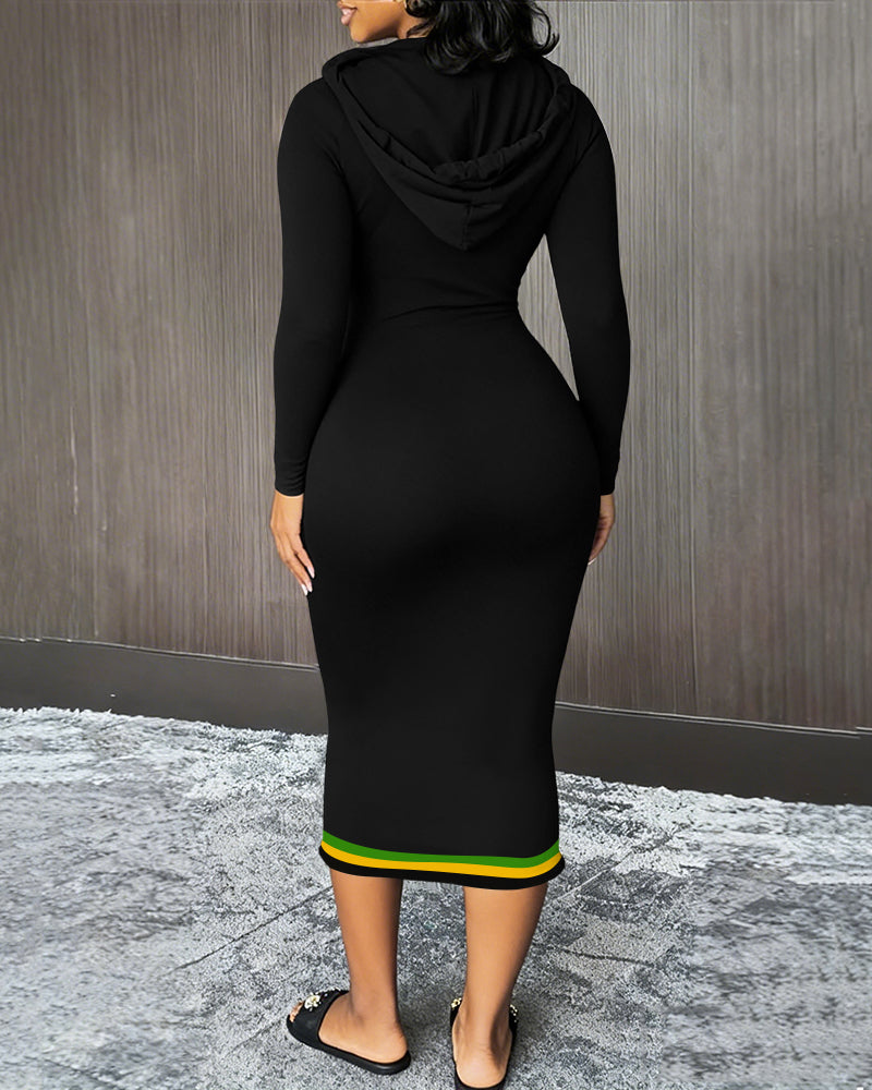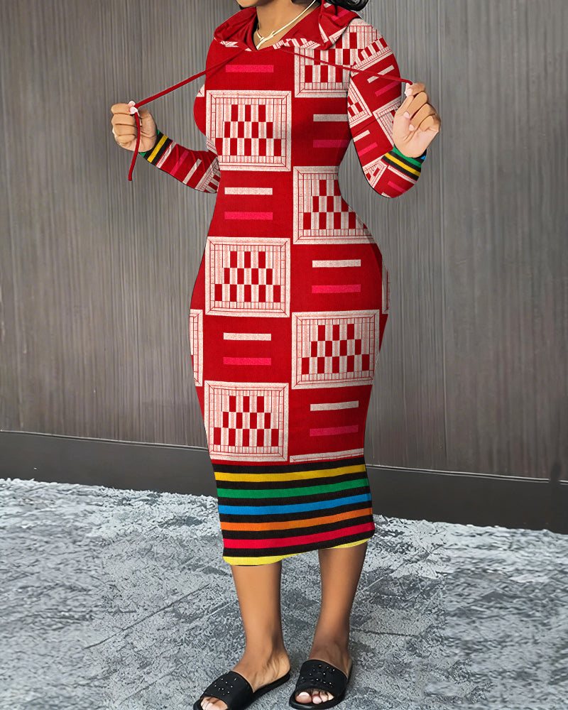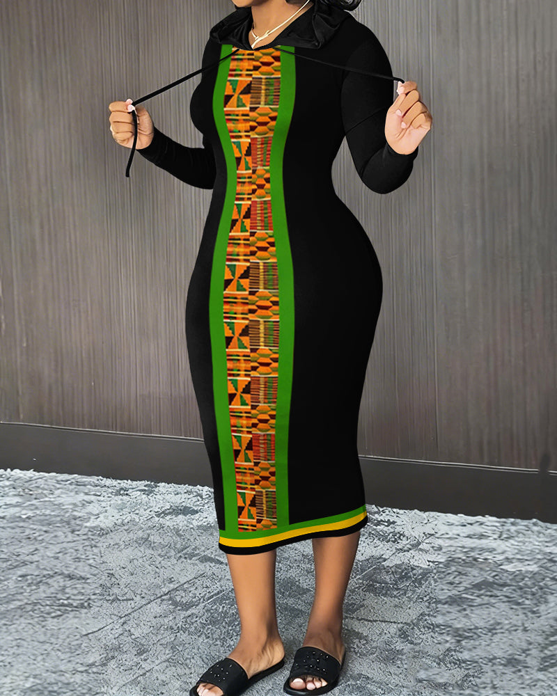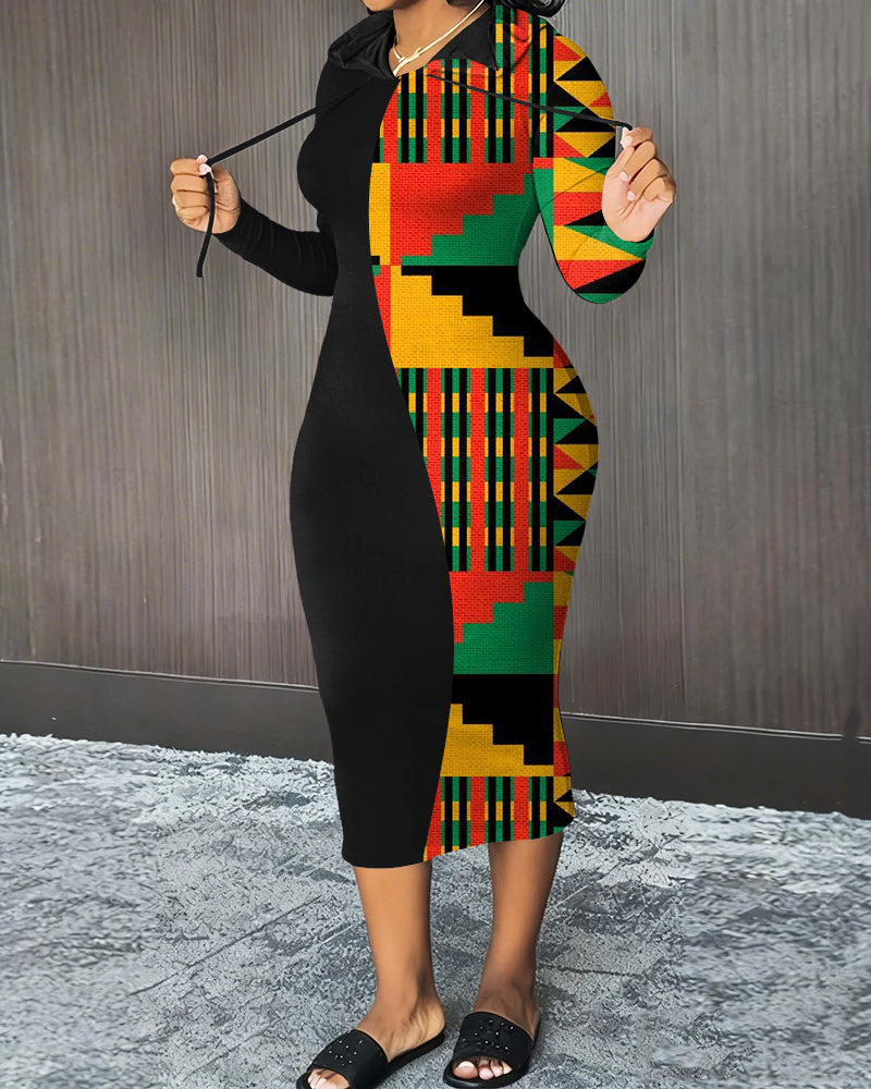 Reggae Geometric Print Patchwork Hooded Long Sleeve Hip Dress