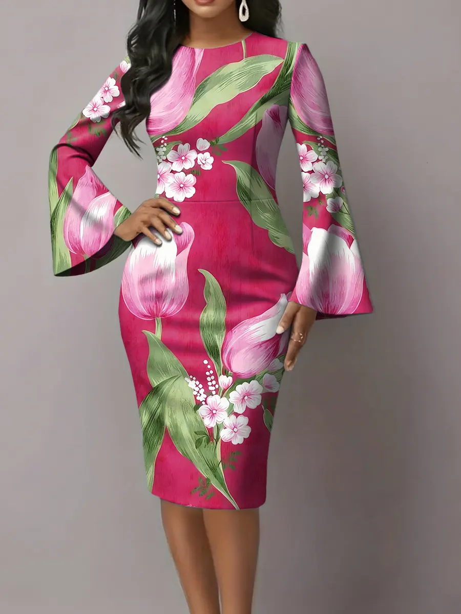 Women's Colorful Floral Art Print Flared Sleeves Midi Bodycon Dresses