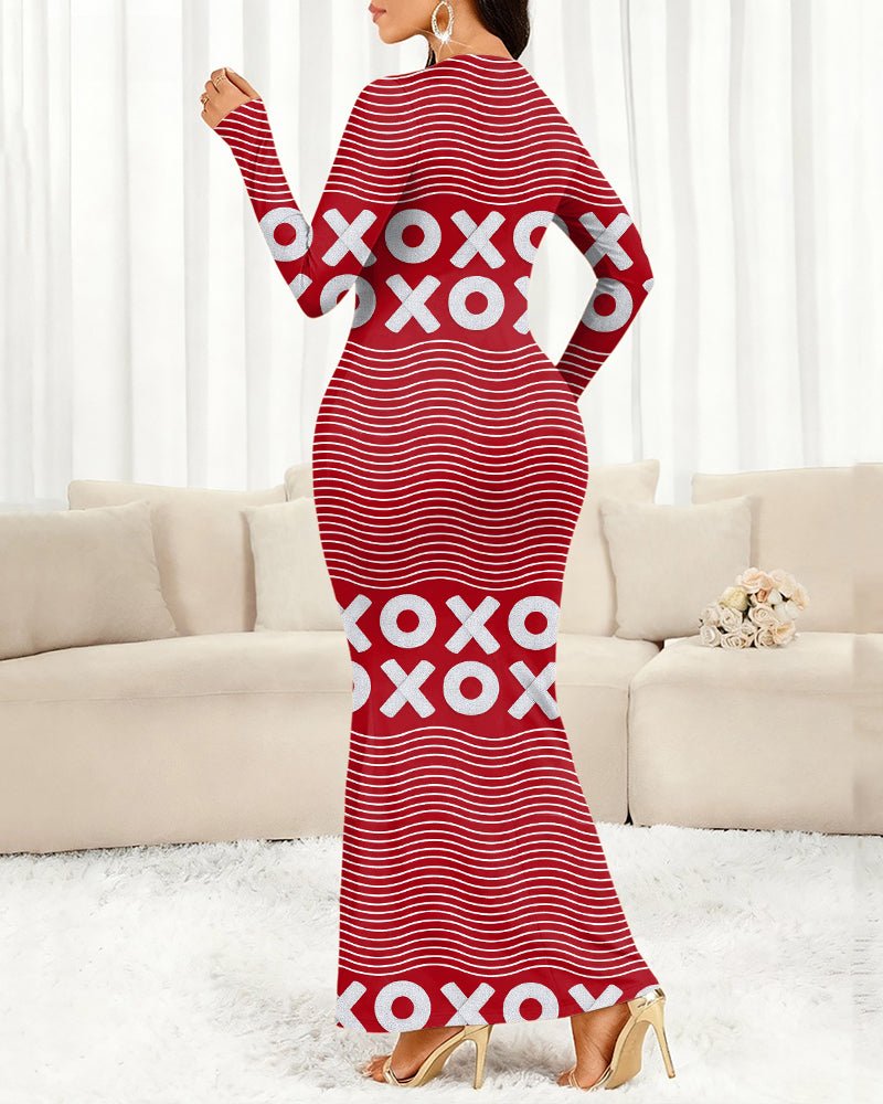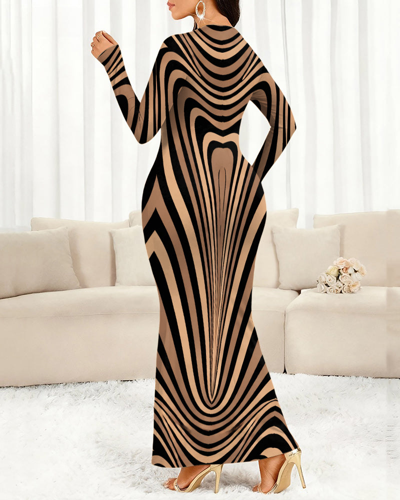 Fun Brown Irregular Stripes Round Neck Long Sleeve Bodycon Dress