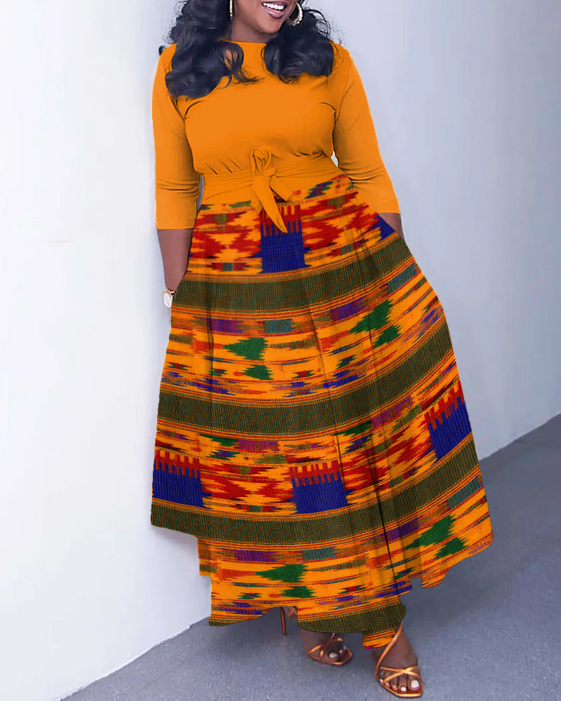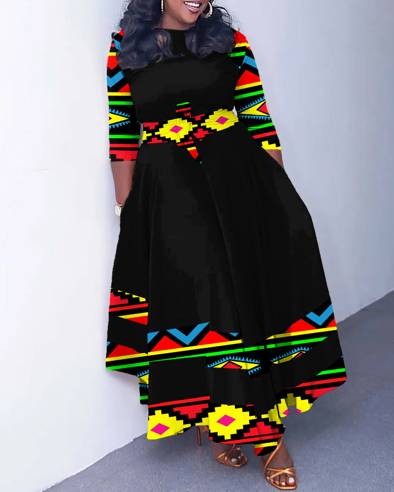 Crew Neck African Color In Tribal Splicing Straps Pockets Maxi Dress