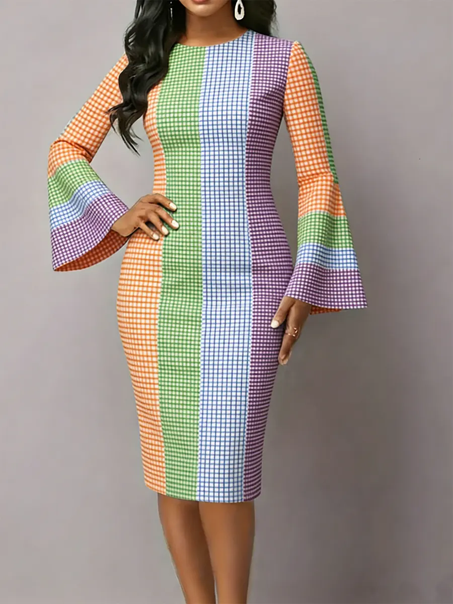 Women's Colorful Abstract Plaid Art Prints Flared Sleeves Midi Bodycon Dresses