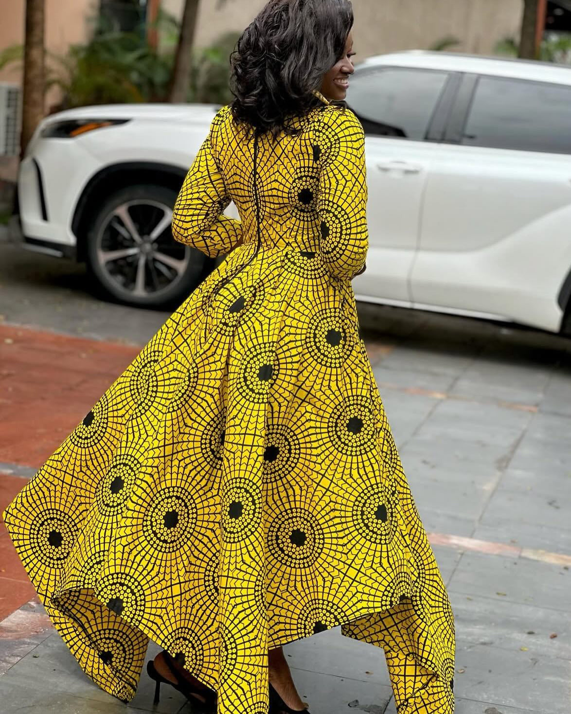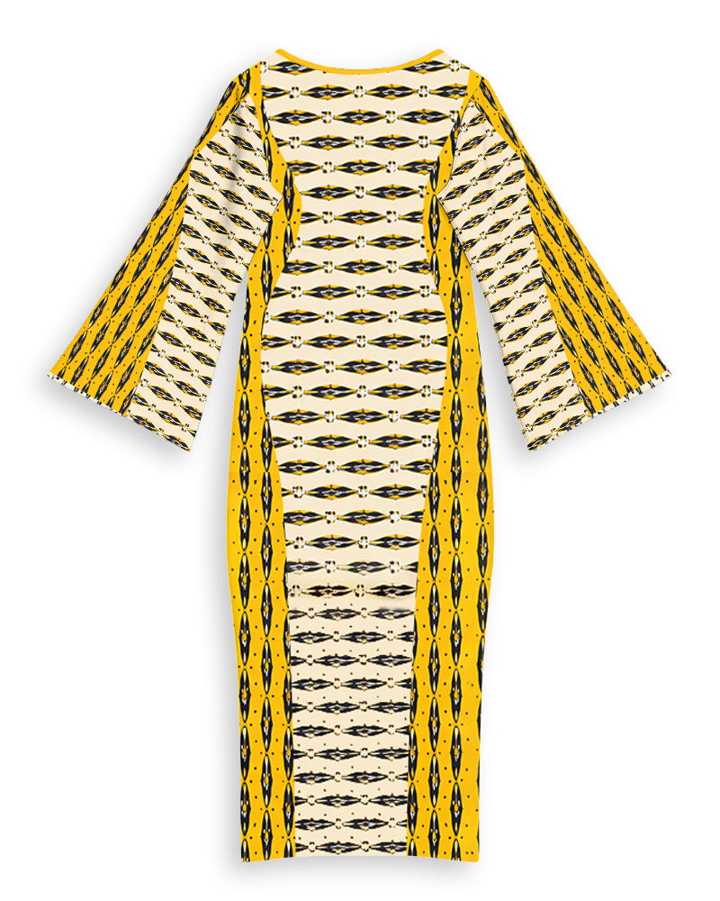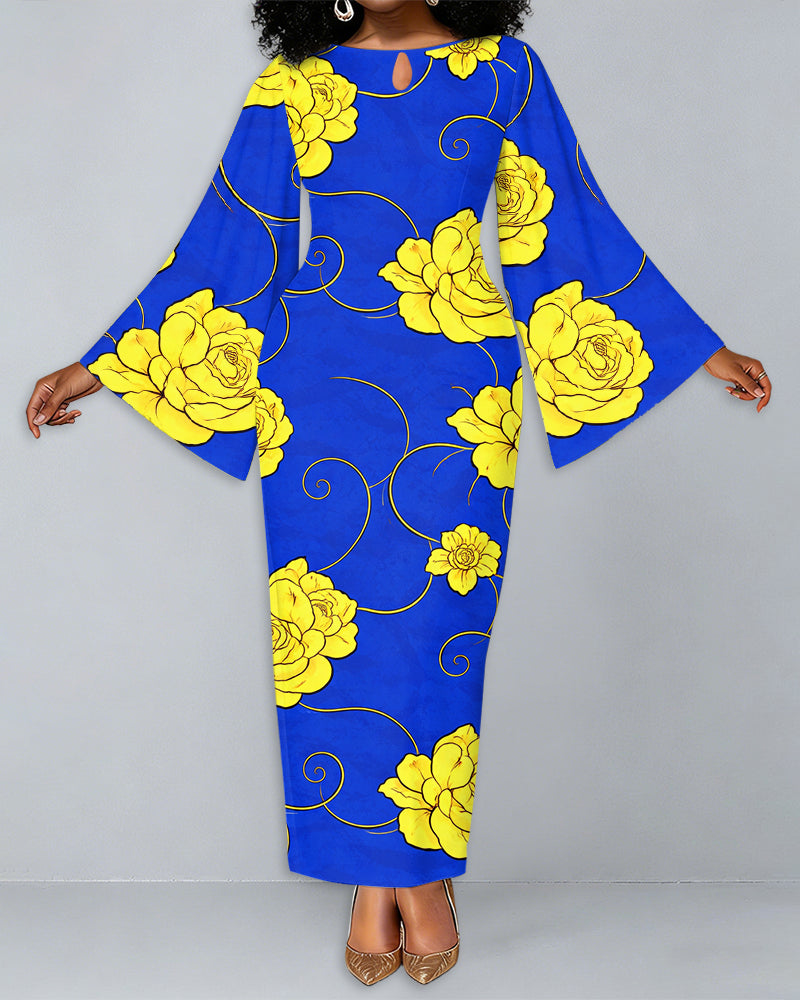 Ankara Large Yellow Flowers Round Neck Bell Sleeve Bodycon Long Dress