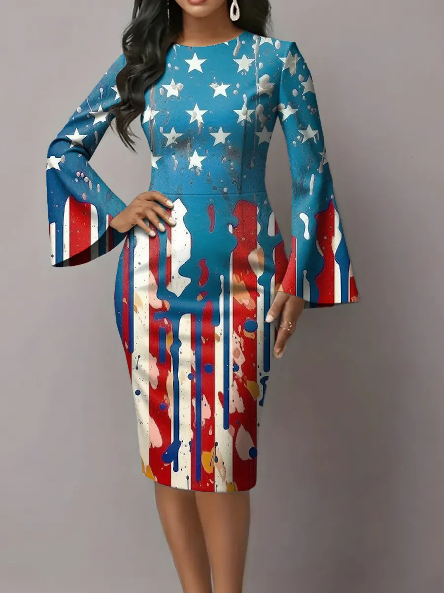 Women's Abstract Flag Art Print Flared Sleeves Midi Bodycon Dresses