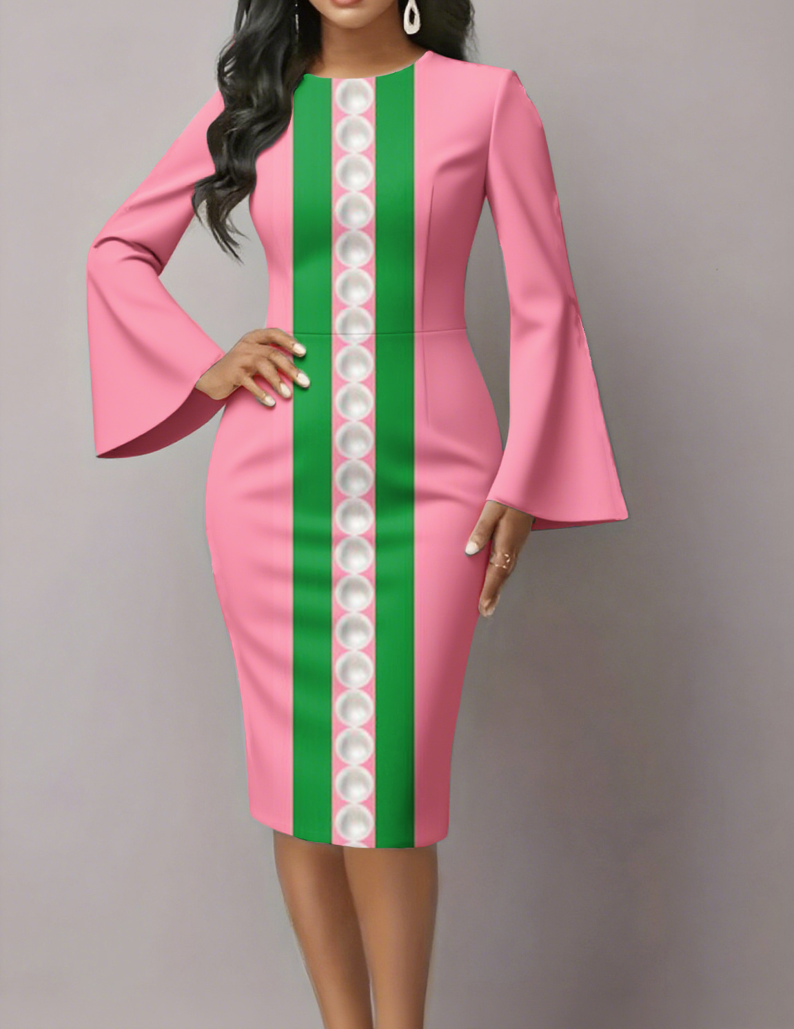 Women's Fashion Pink And Green Sisterhood Art Print Flared Sleeves Midi Bodycon Dresses