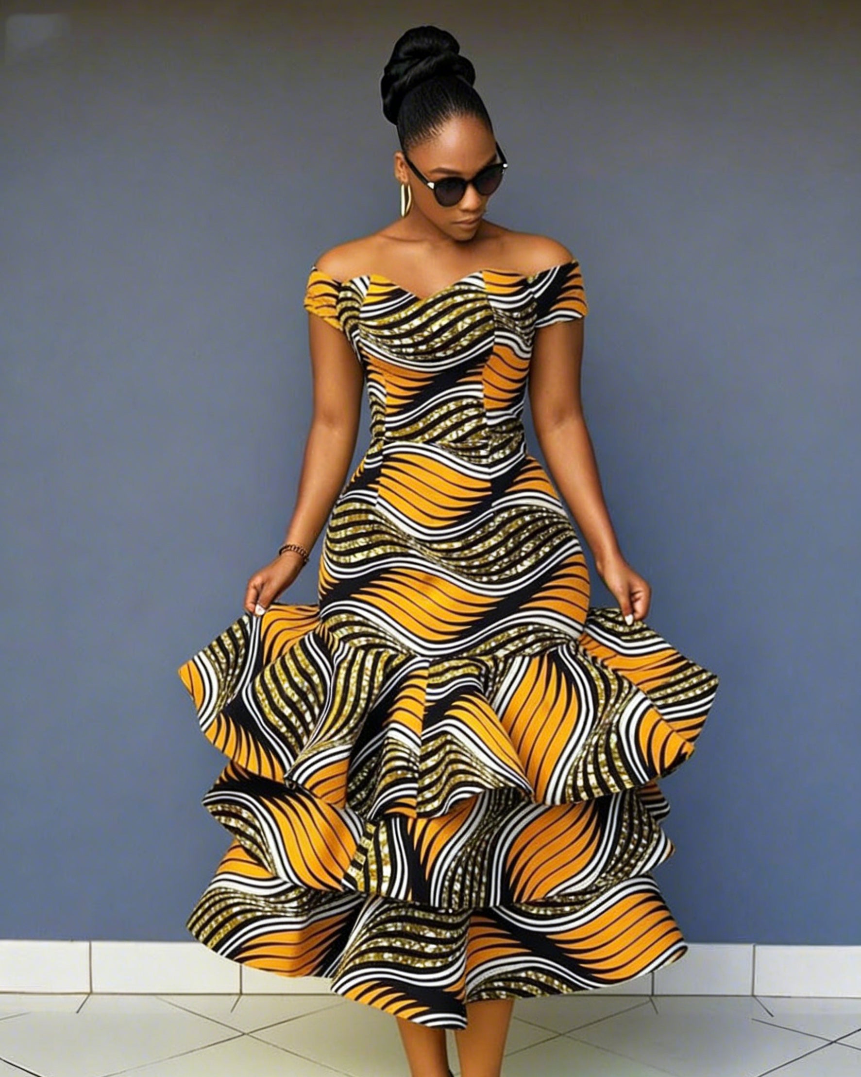 African Abstract Art Print Flared Sleeves Mini Dresses