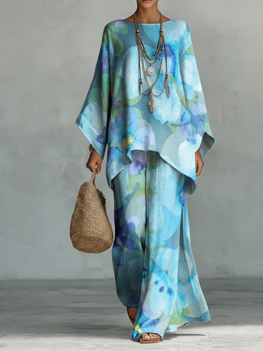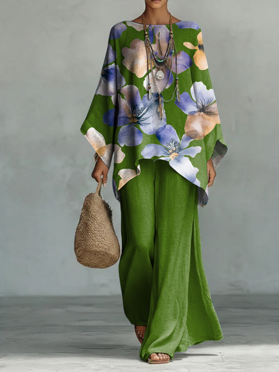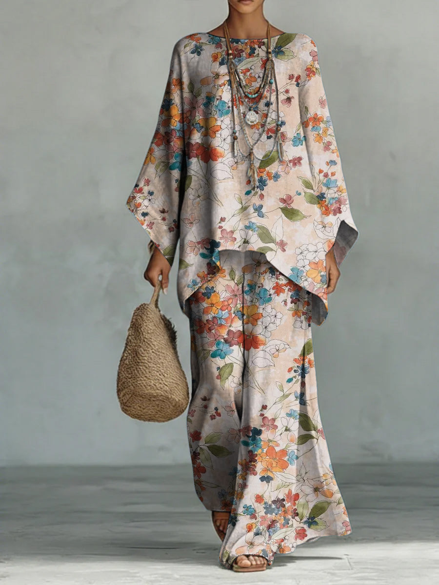 Women's Vintage Floral Art Comfortable Loose Cotton Linen Wide-leg Pants Two-piece Set