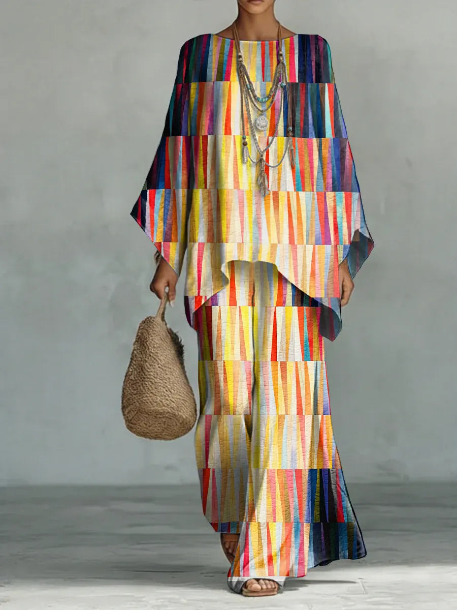 Colorful Geometric Stripe Decorative Pattern Long Sleeve Cotton Linen Top And Pants