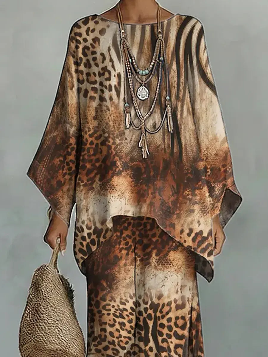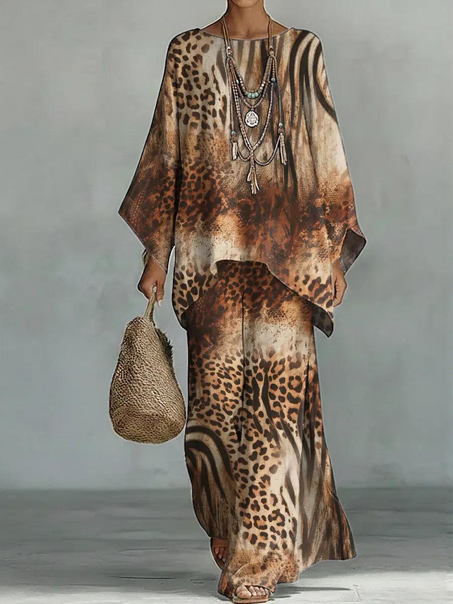 Women's Vintage Leopard Art Comfortable Loose Cotton Linen Wide-leg Pants Two-piece Set
