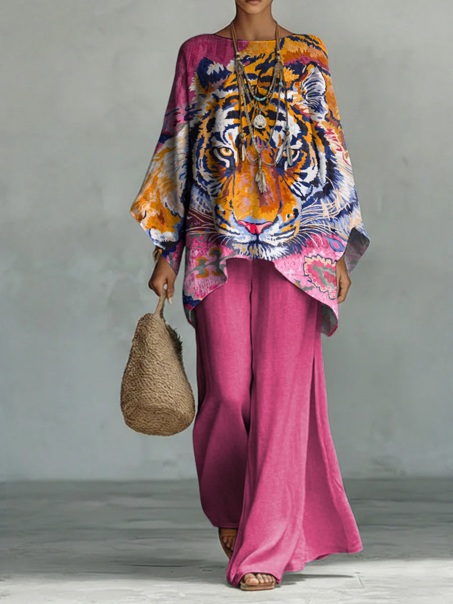 Tiger And Flower Decorative Patterns Long Sleeve Cotton Linen Top And Pants