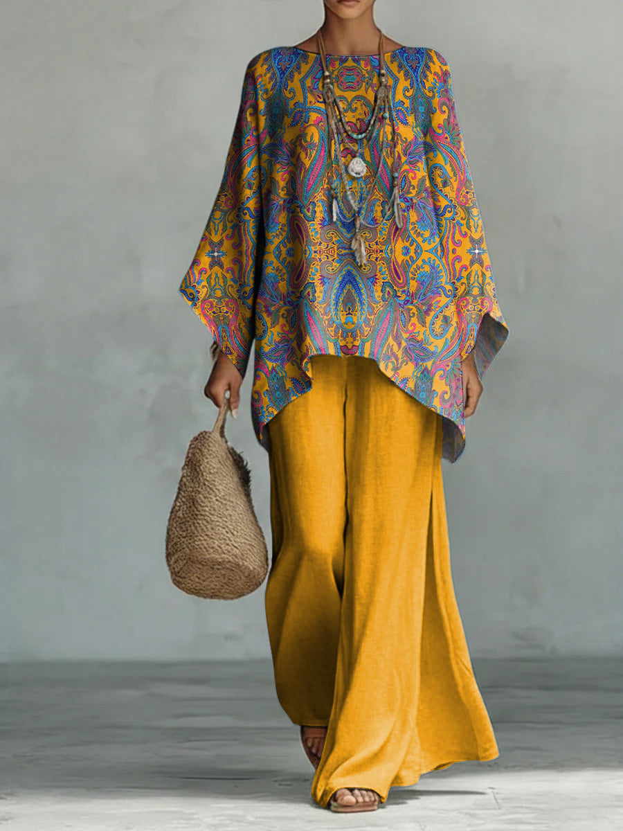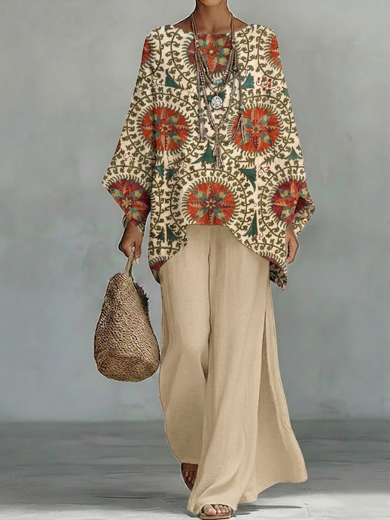Women's Vintage Ethnic Floral Art Comfortable Loose Cotton Linen Wide-leg Pants Two-piece Set