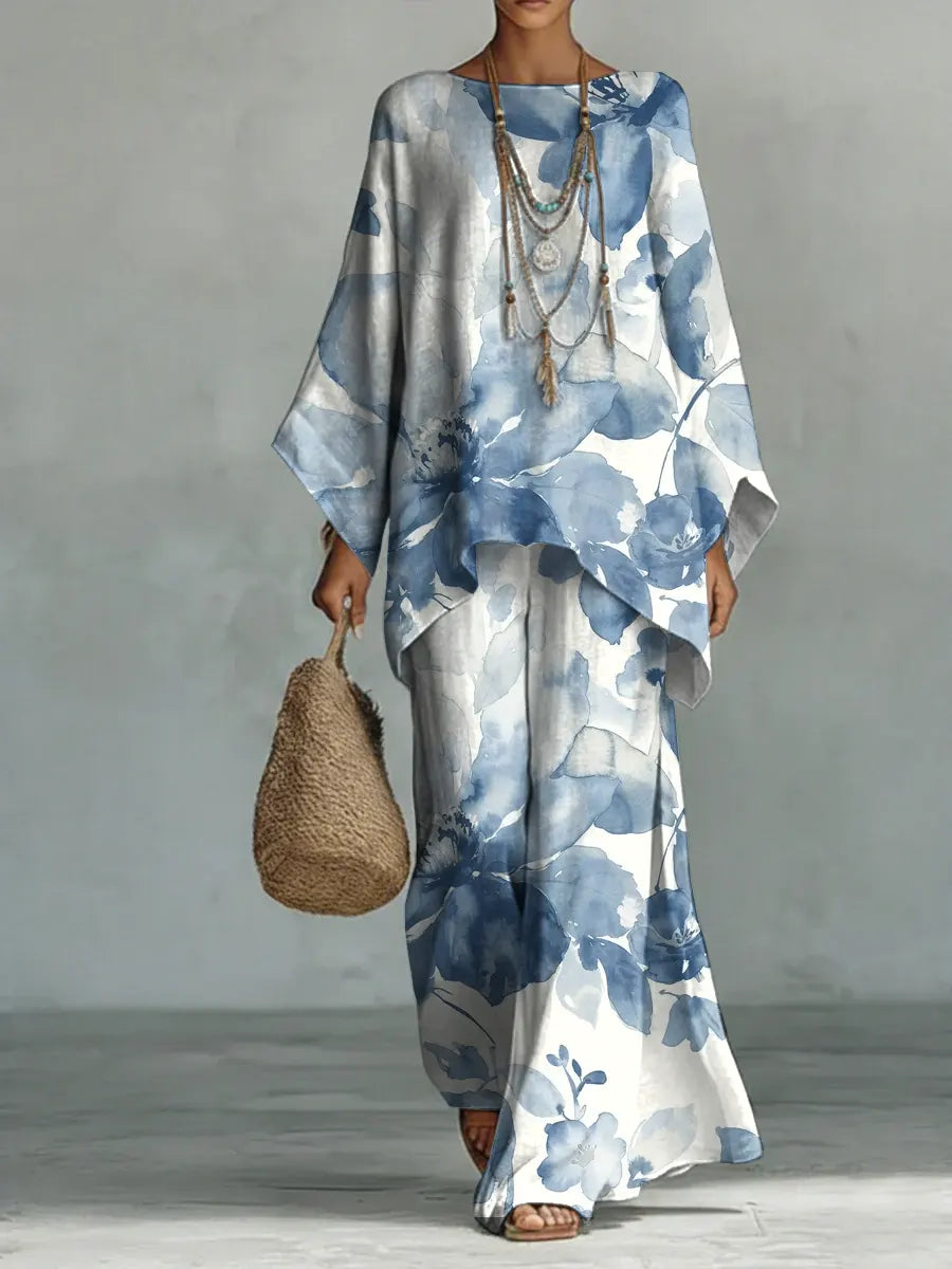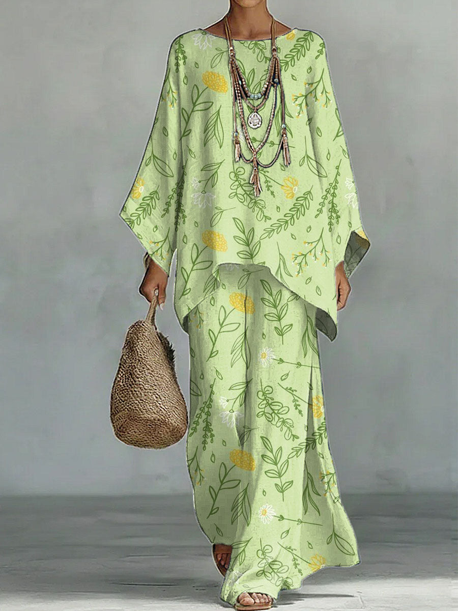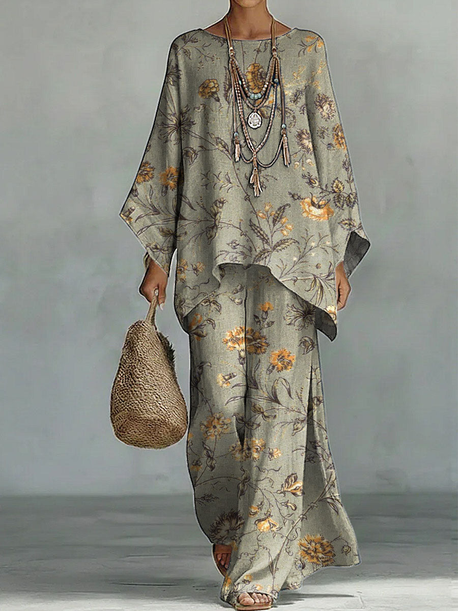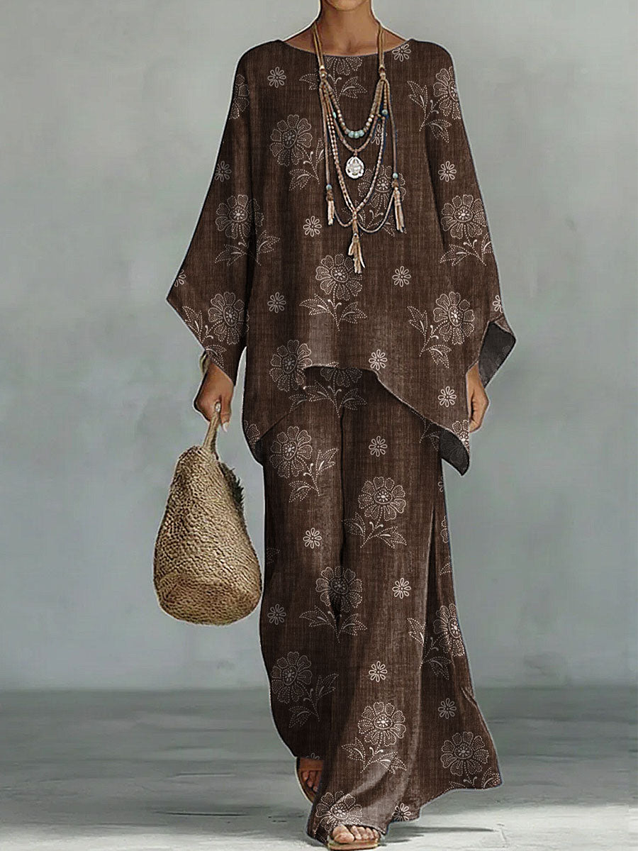 Women's Vintage Floral Art Comfortable Loose Cotton Linen Wide-leg Pants Two-piece Set