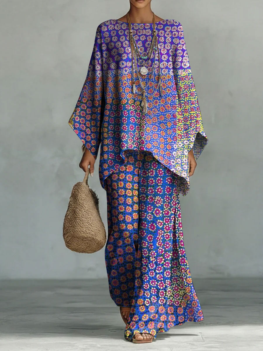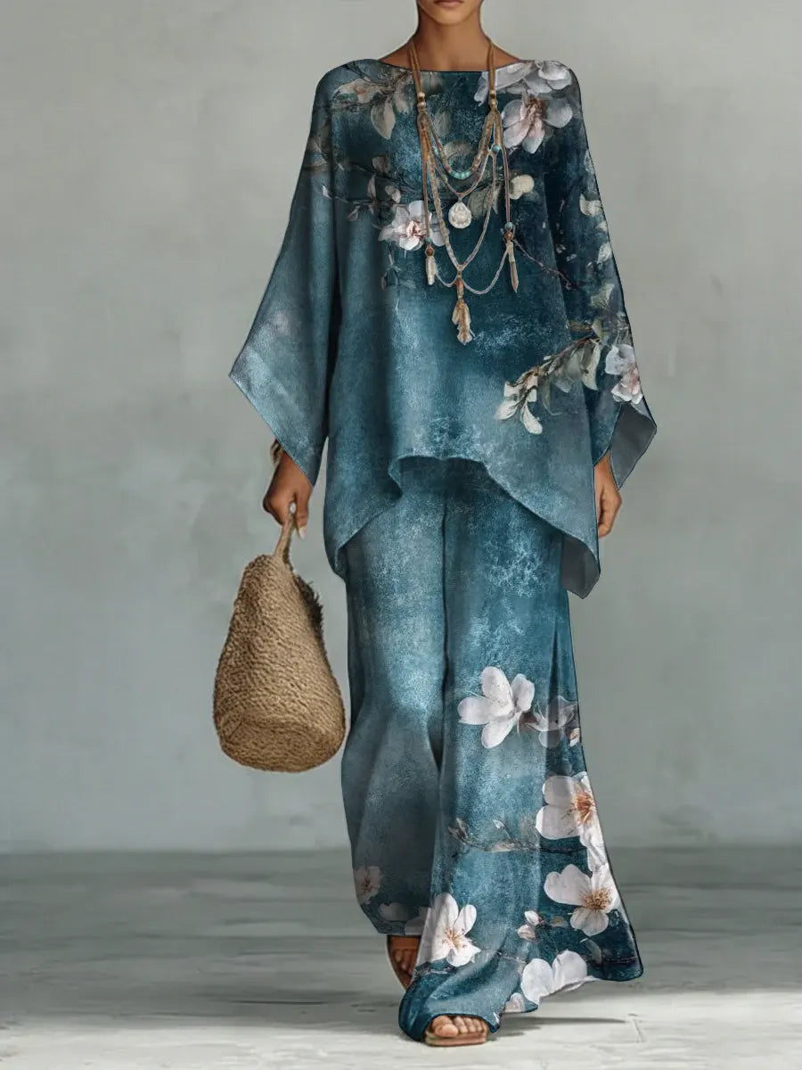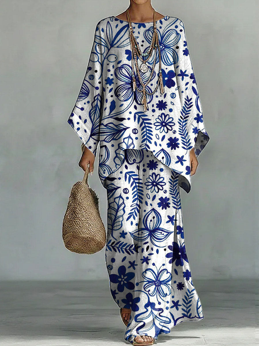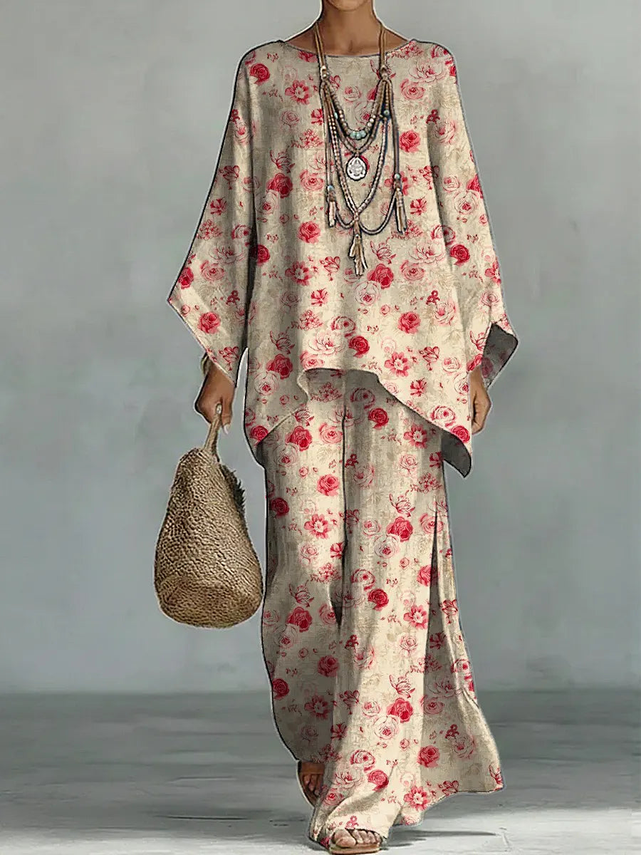 Women's Vintage Floral Art Comfortable Loose Cotton Linen Wide-leg Pants Two-piece Set