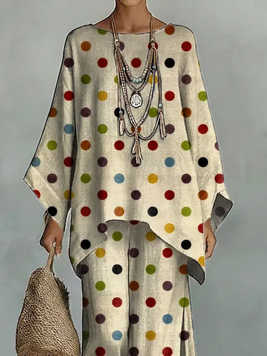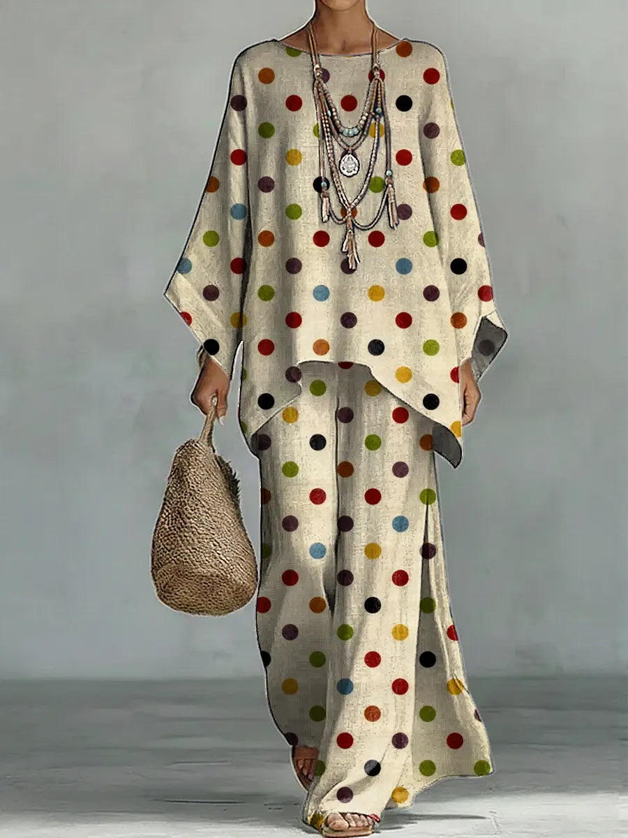 Women's Retro Dot Art Print Casual Cotton Linen Suits