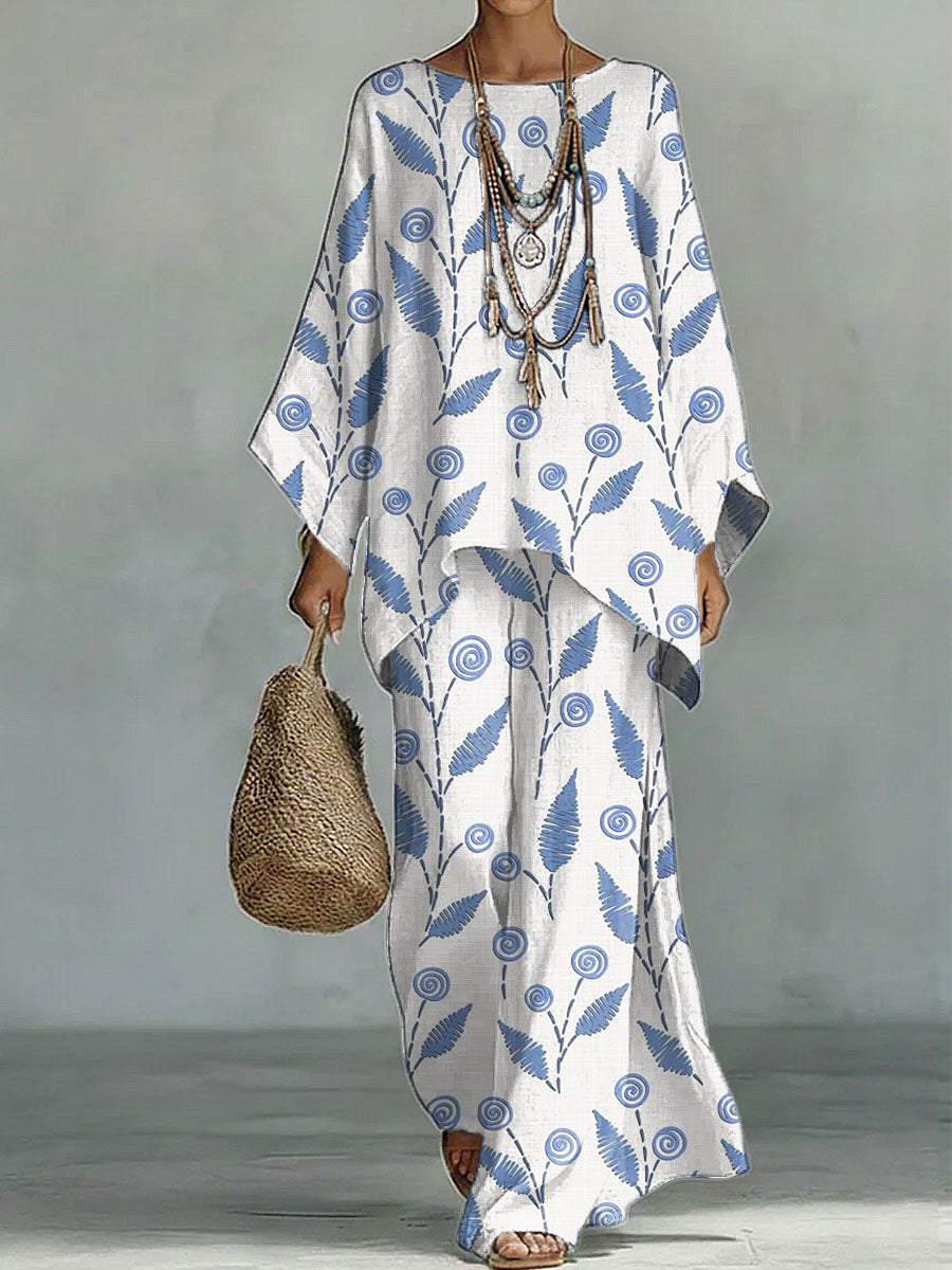 Women's Vintage Print Linen Cotton Top And Wide-leg Pants Two-piece Set.