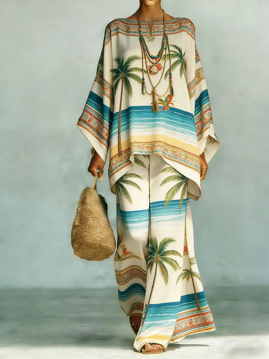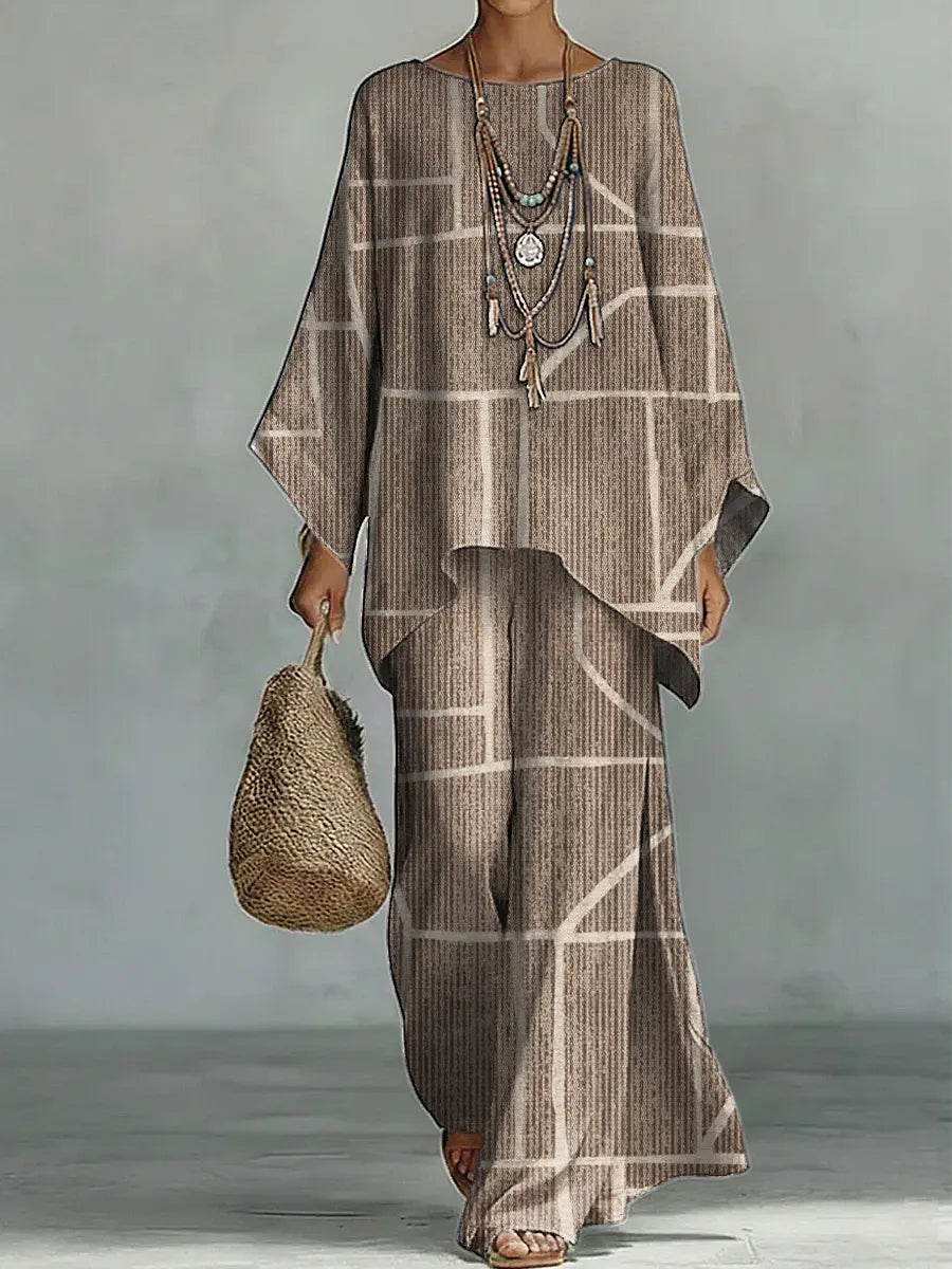 Women's Geometry Print Linen Cotton Top And Wide-leg Pants Two-piece Set.