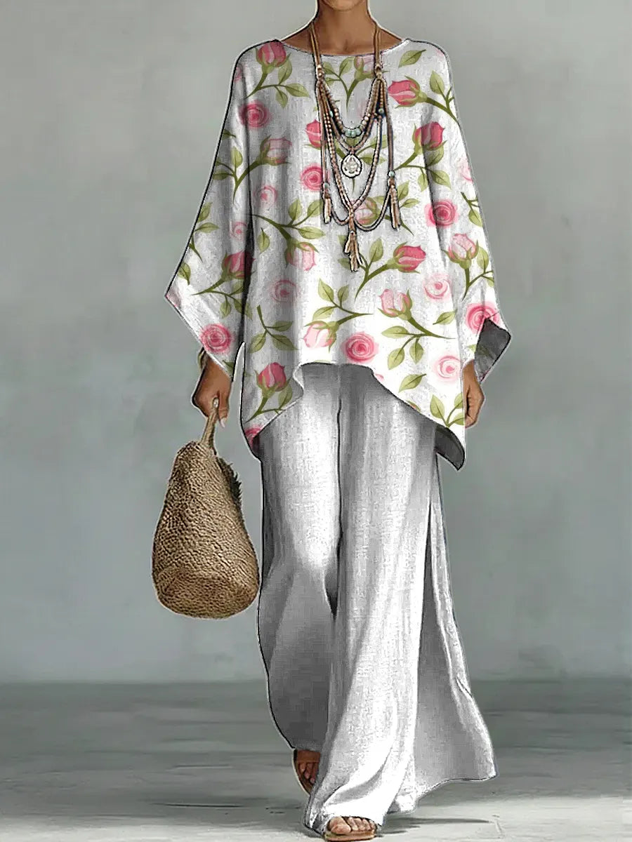 Women's Floral Print Linen Cotton Top And Wide-leg Pants Two-piece Set.