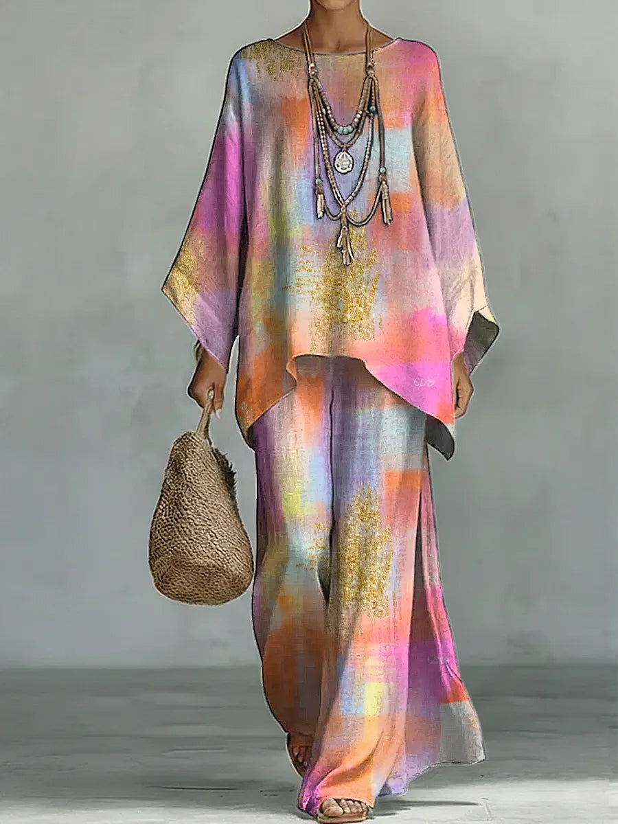 Abstract-style Colorful Decorative Patterns Casual Long Sleeve Cotton Linen Top And Pants