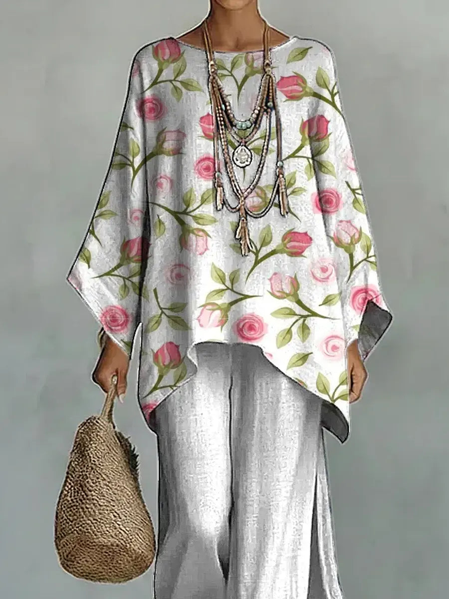 Women's Retro Flower Art Print Casual Cotton Linen Suits