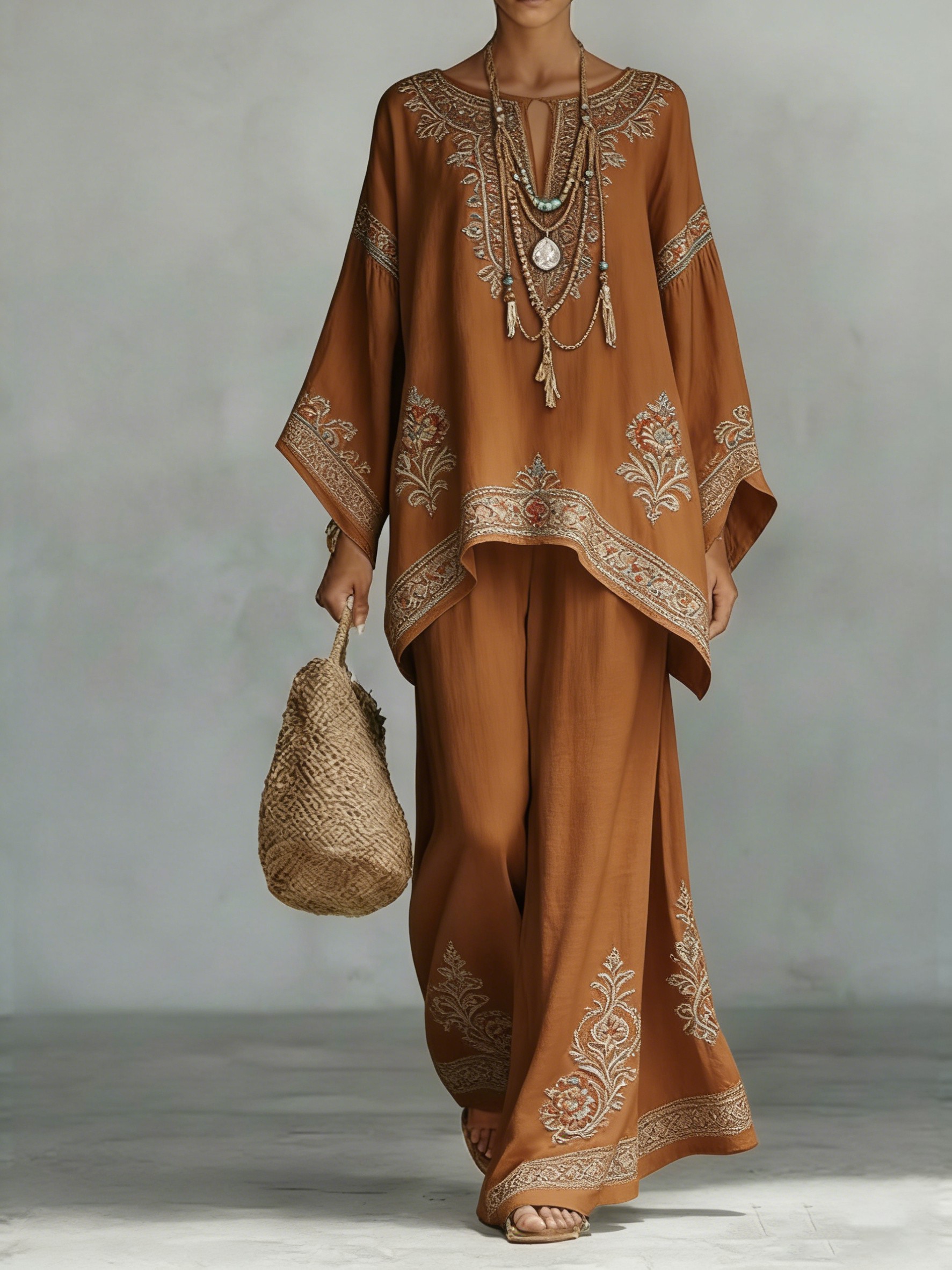 Women's Vintage Ethnic Floral Art Comfortable Loose Cotton Linen Wide-leg Pants Two-piece Set