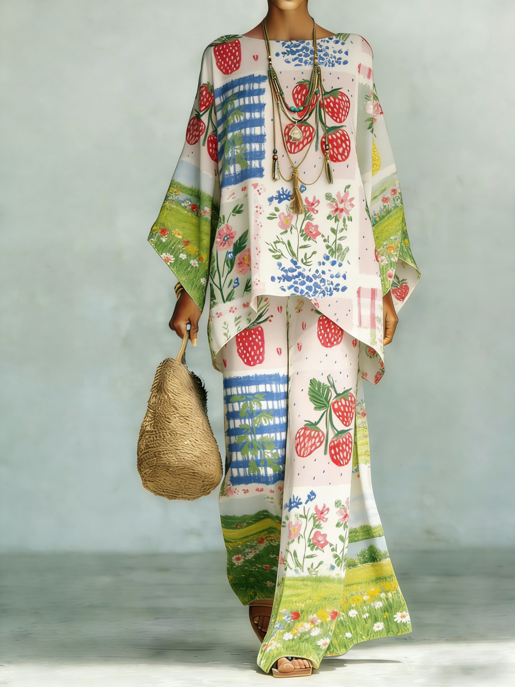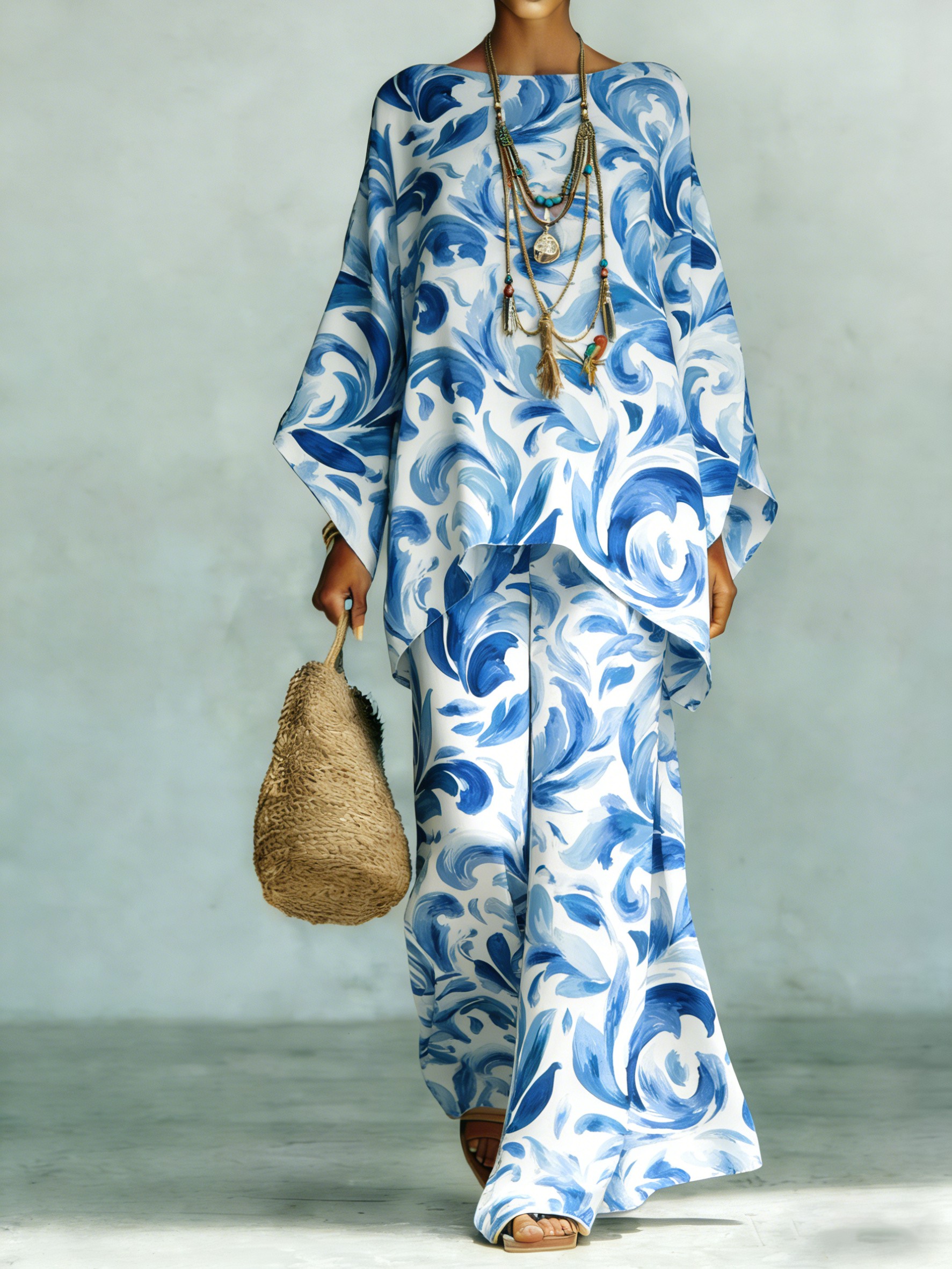 Women's Comfortable and loose print pattern cotton and linen wide-leg pants two-piece set