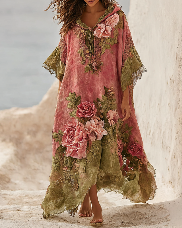 Women's Summer Vacation Floral 3D Embroidery Hooded Kaftan 1592