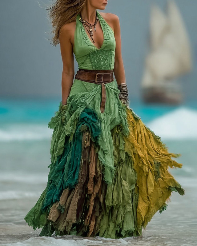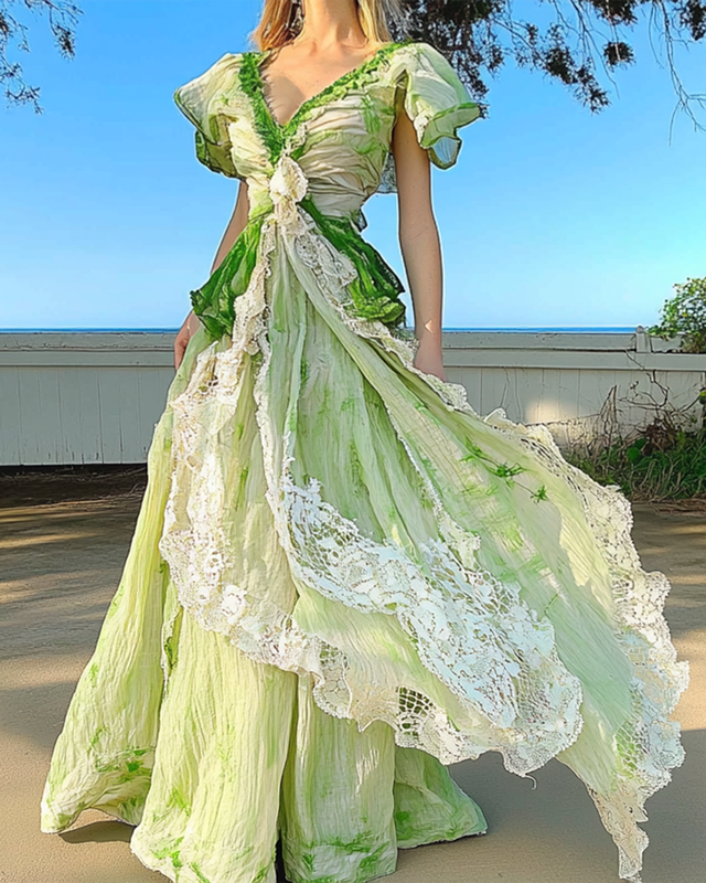 Elegant Seaside Irregular Patchwork Green Dress c60b