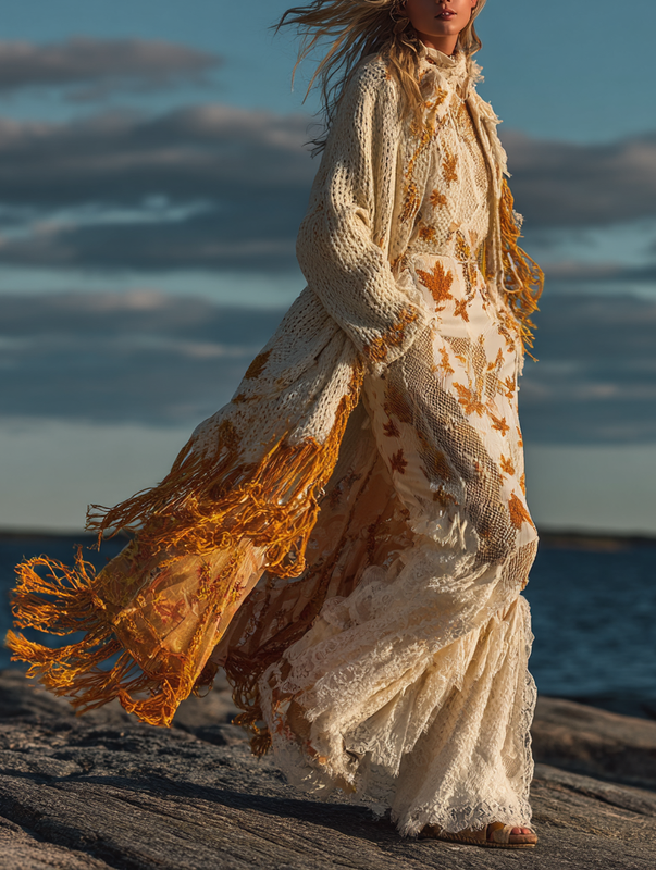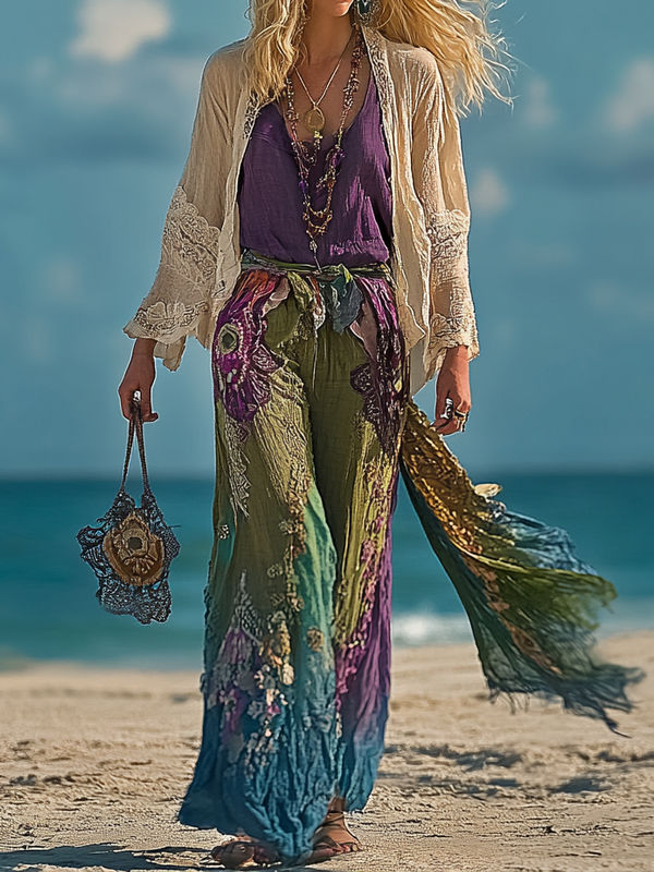 Summer Vacation Seaside Embroidered Lace Patchwork Linen Dress 40a9