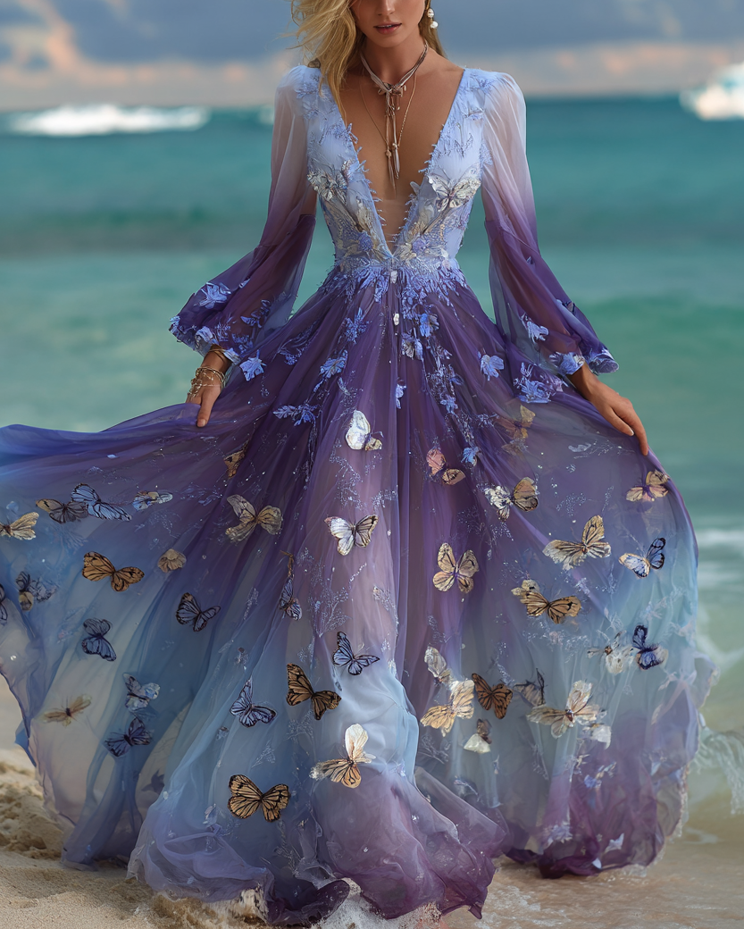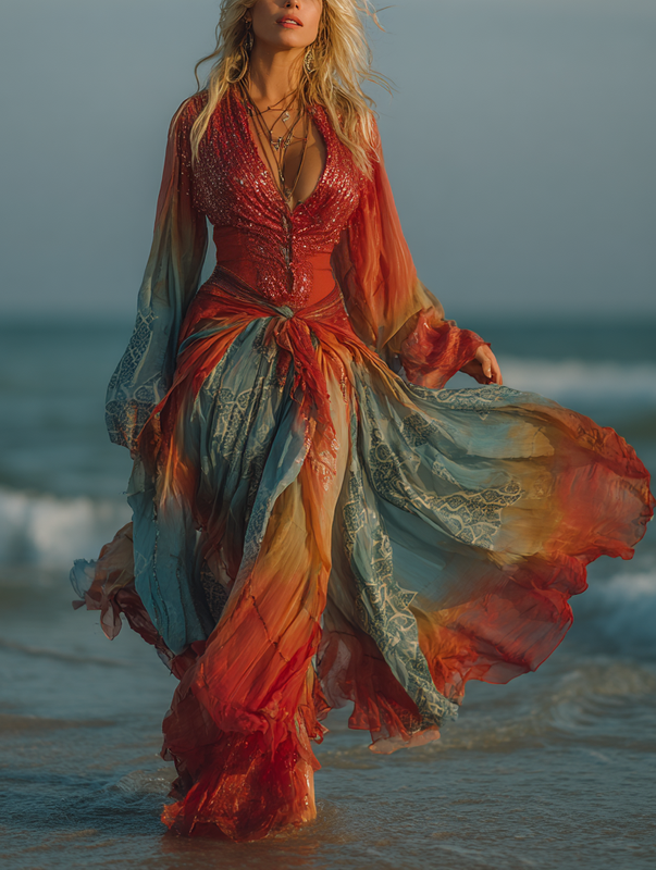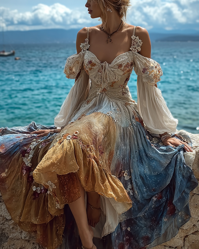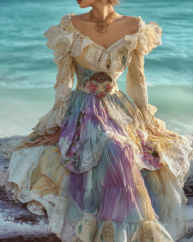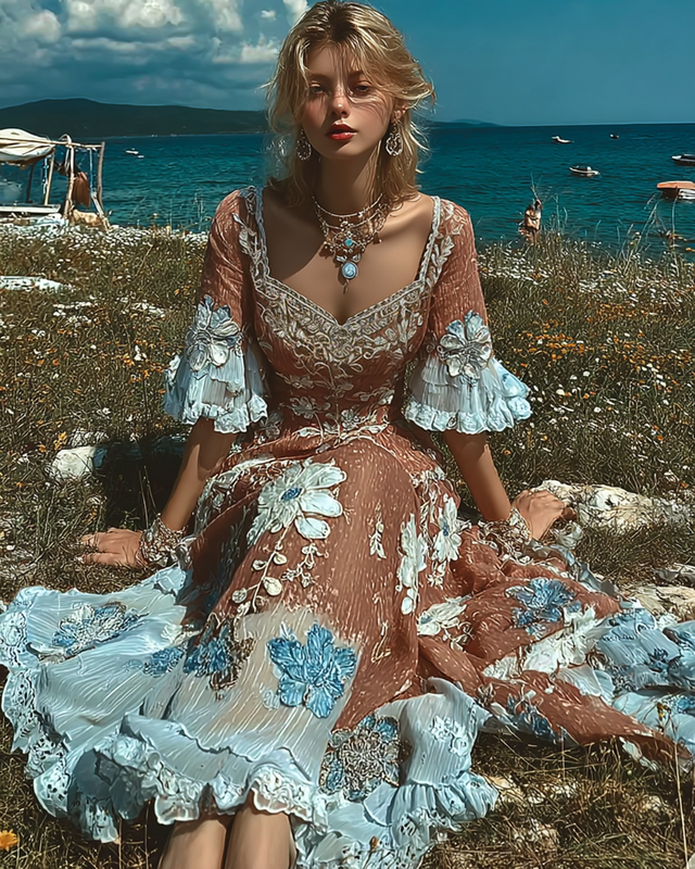 Summer Floral Embroidered Contrast Gradient Ruffle Dress 3a88