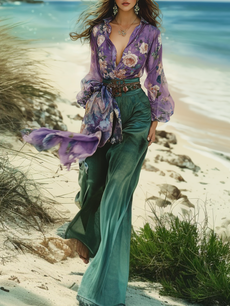 Autumn seaside long-sleeved contrasting retro top + pants set ab10