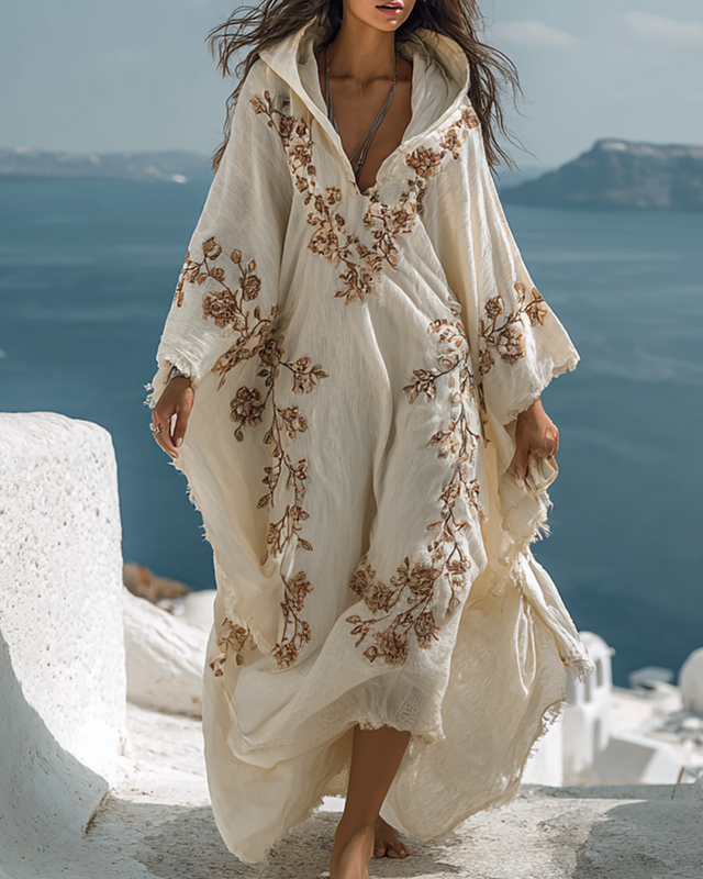 Women's Summer Vacation Floral 3D Embroidery Hooded Kaftan e668