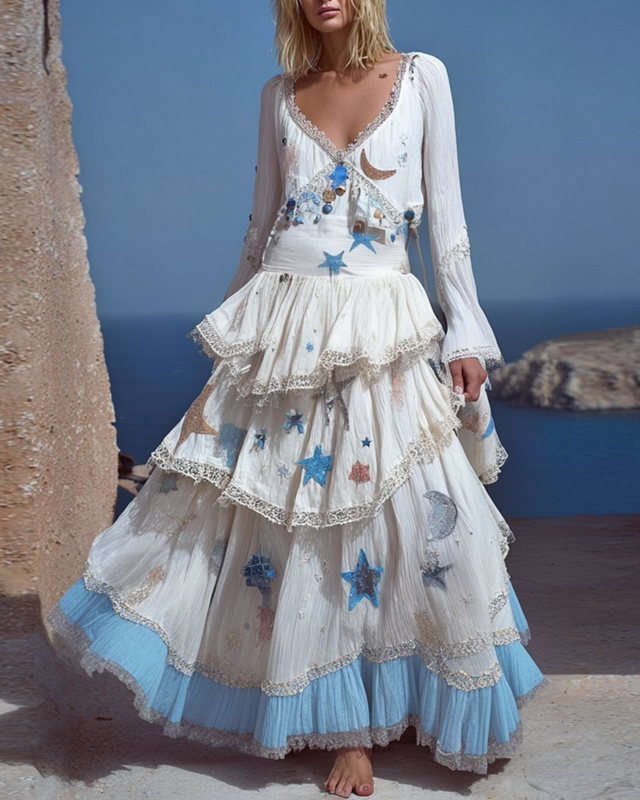 Seaside Star And Moon Embroidered Ruffled Linen Dress a716