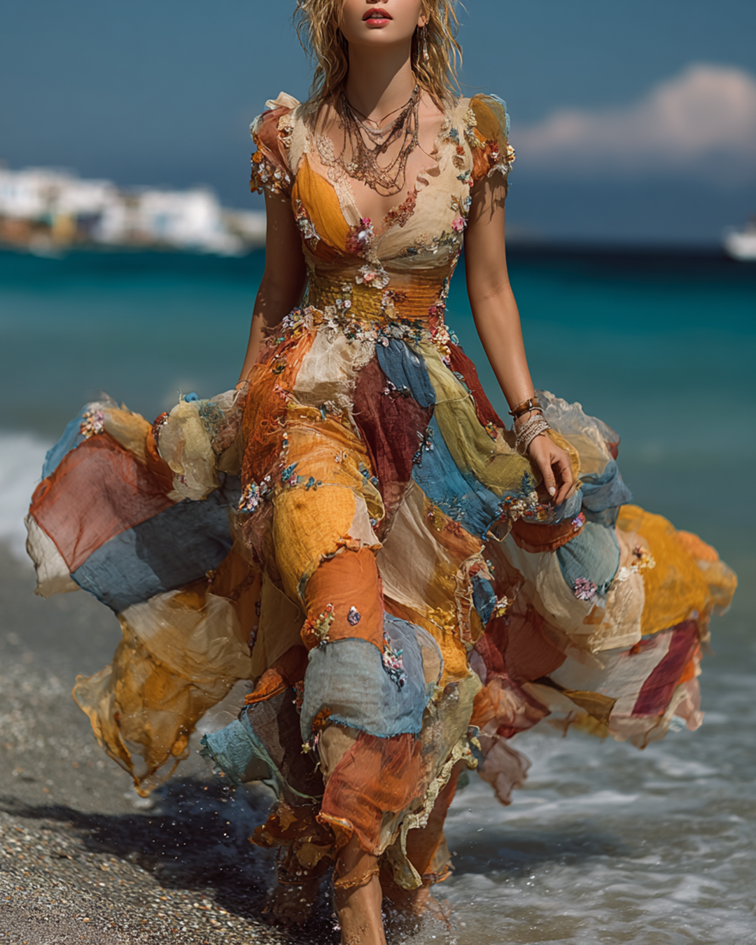 Summer Floral Embroidered Patchwork Contrast Color Dress 1487