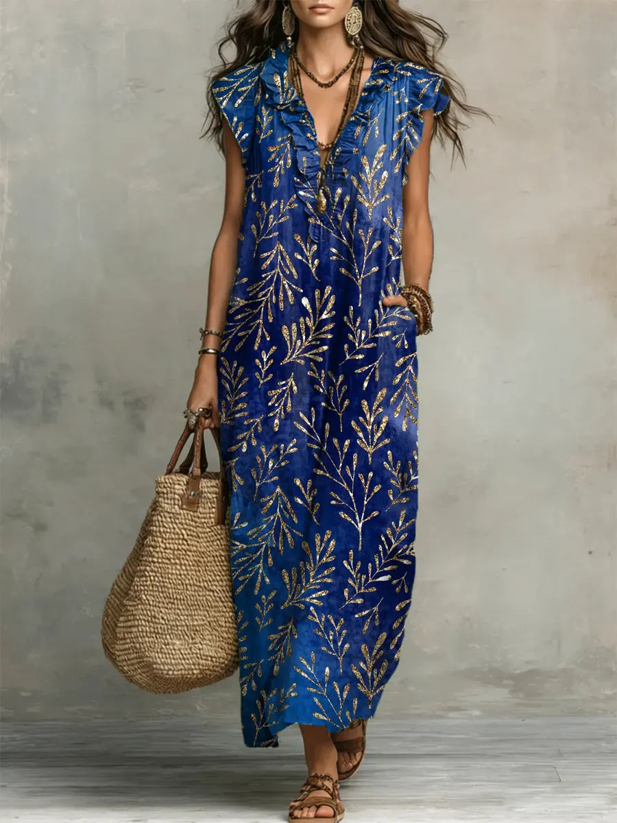 Women's Vintage Print Casual Ruffled Stylish Cotton Linen Dress