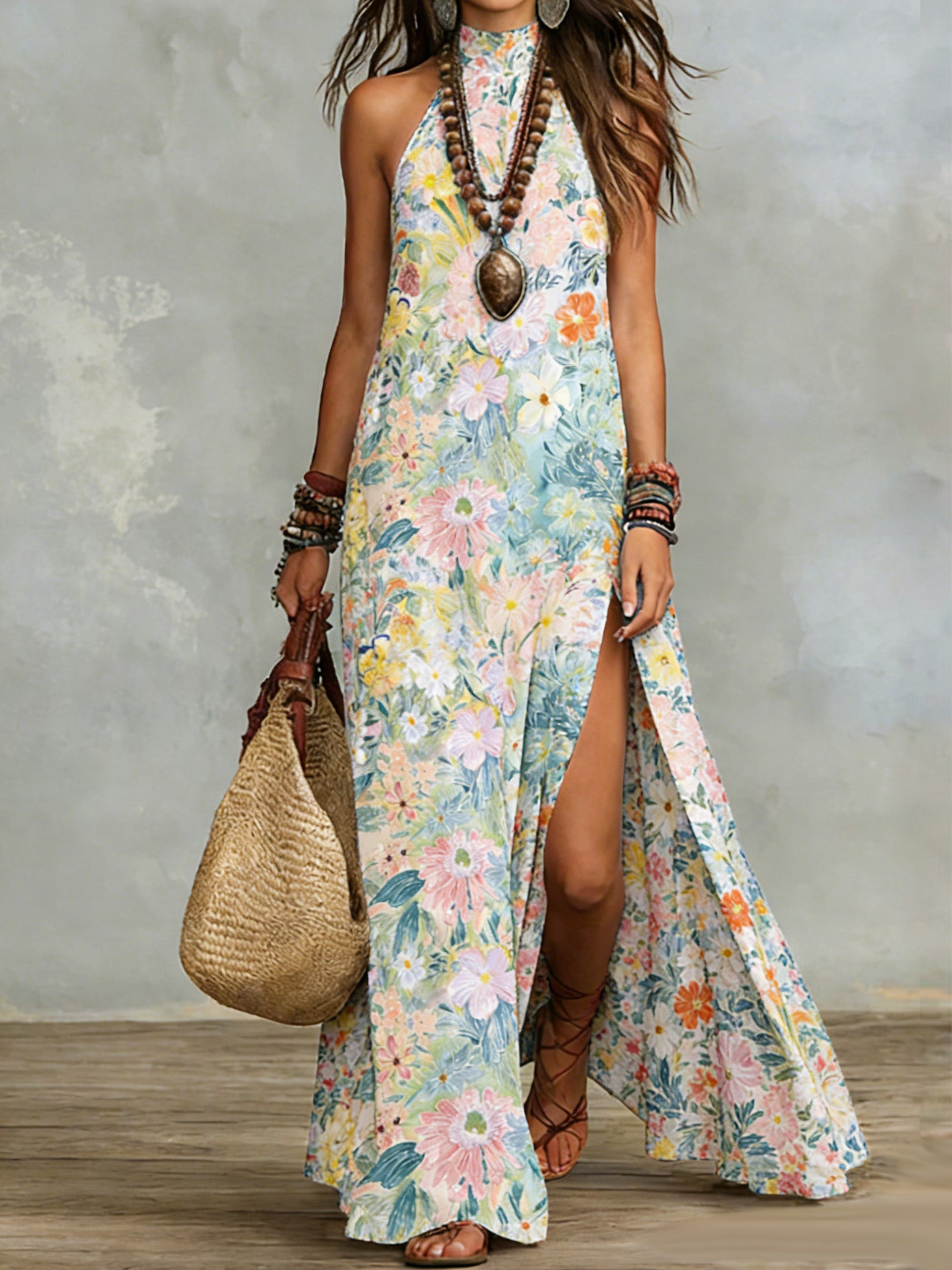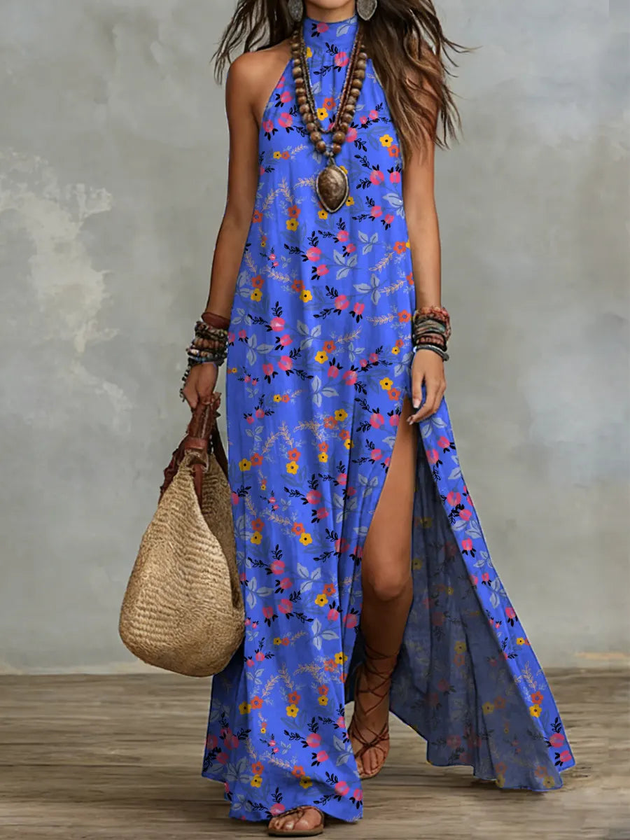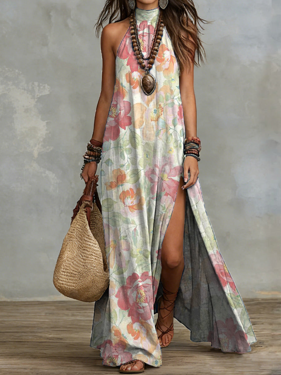 Women's Vintage Floral Art Print Casual Chic Halter Maxi Dress