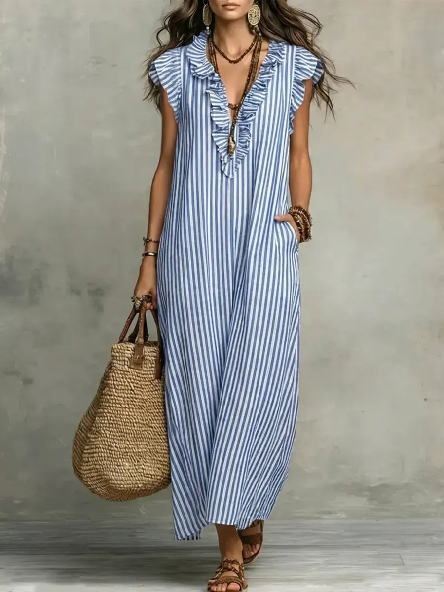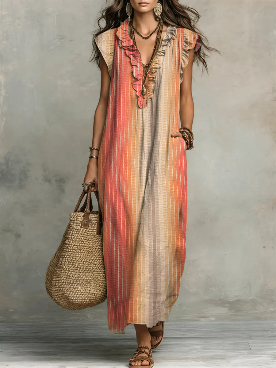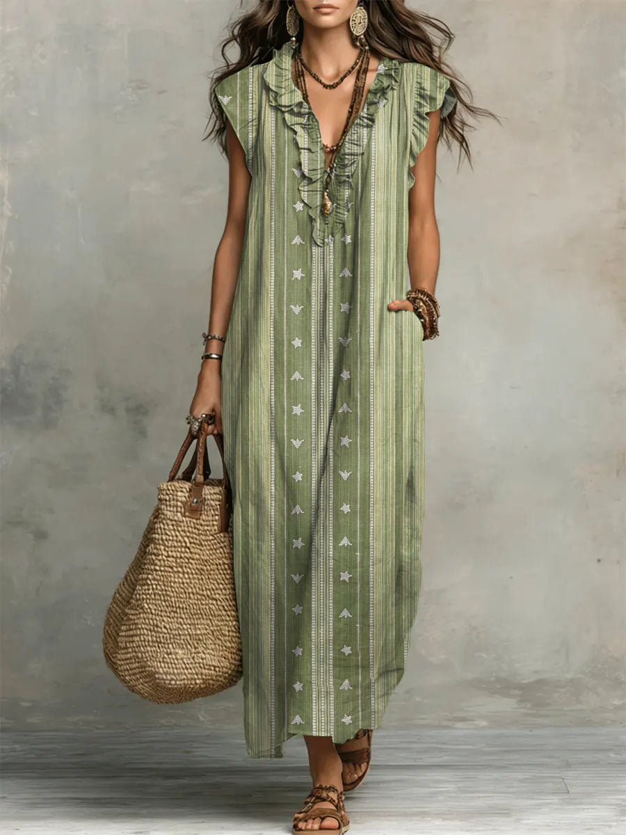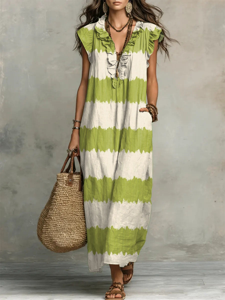 Women's Striped Art Print Casual Ruffled Stylish Cotton Linen Dress