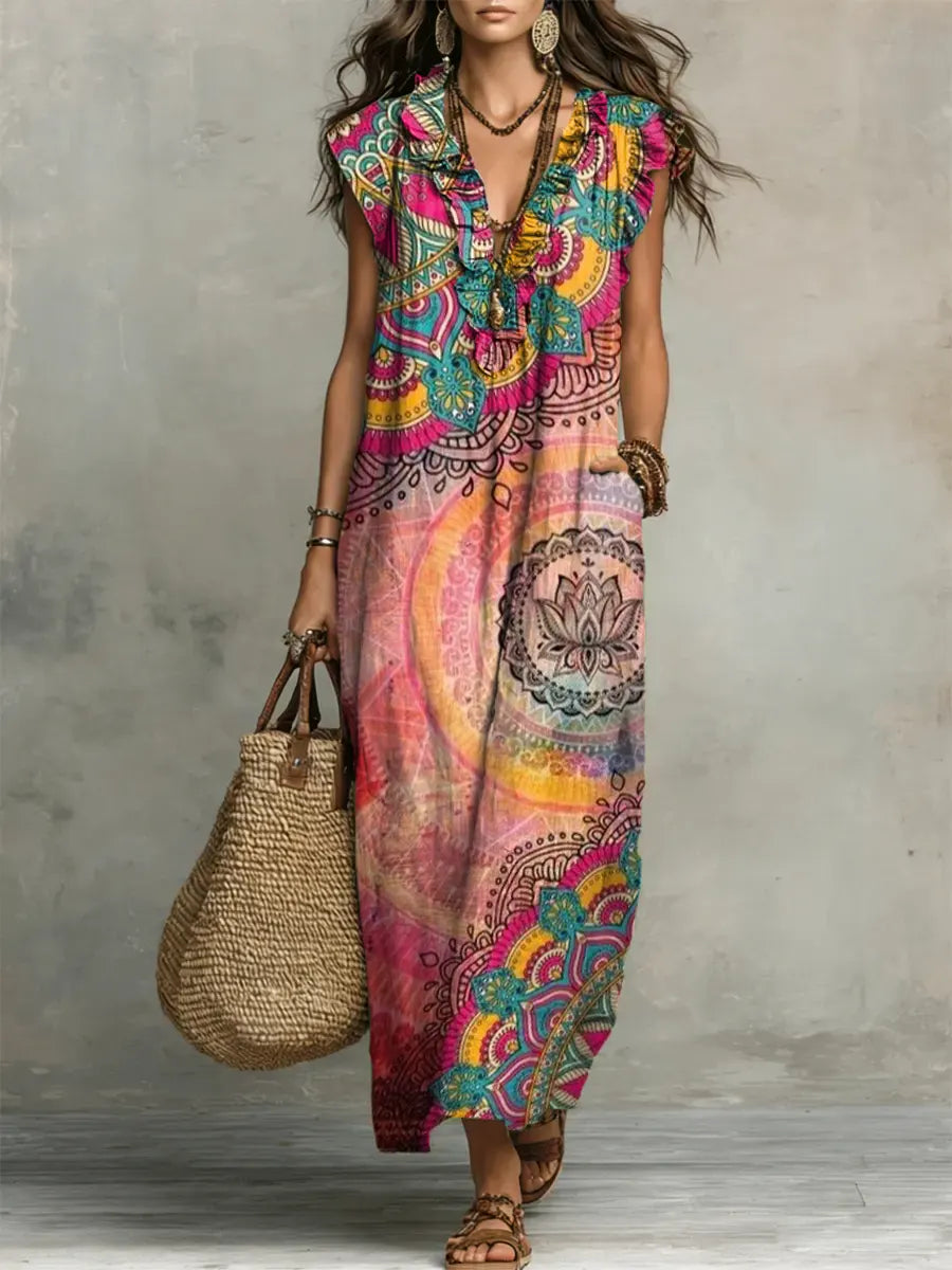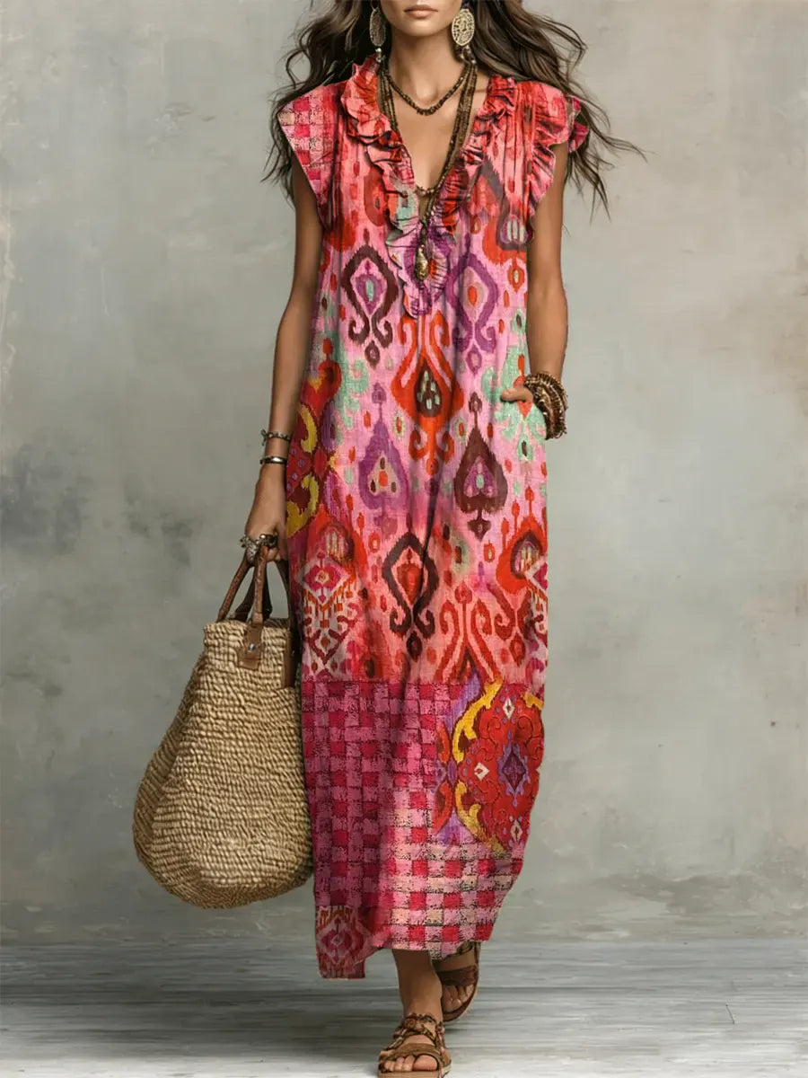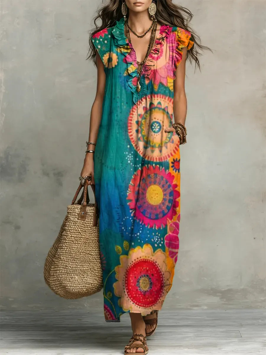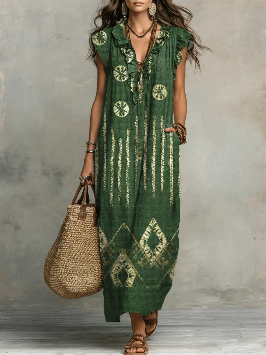 Women's Retro Ethnic Pattern Art Print Casual Ruffled Stylish Cotton Linen Dress