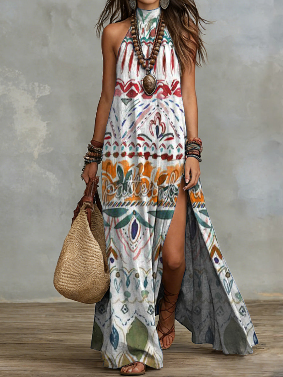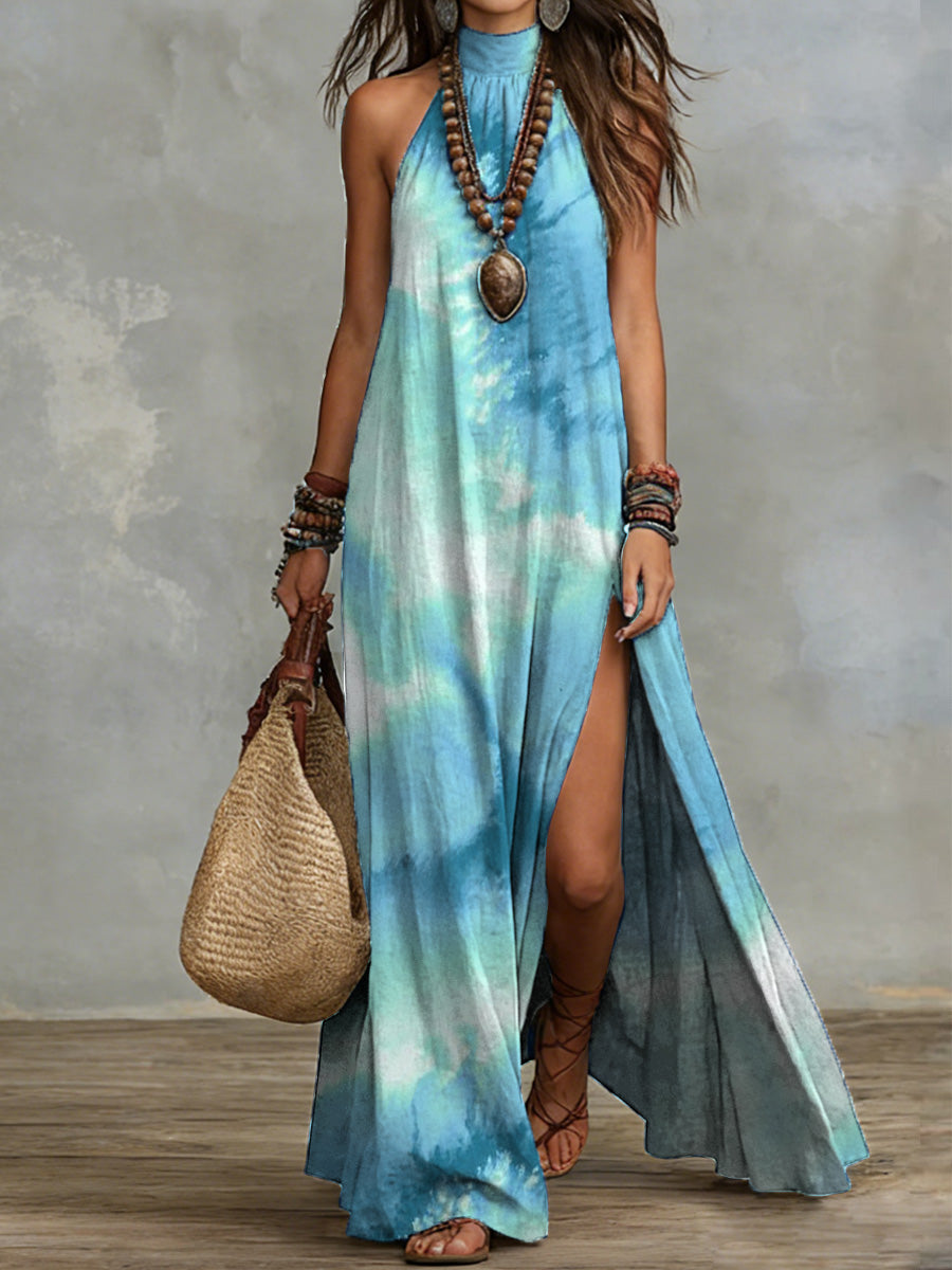 Women's Retro Gradient Art Print Halter Neck Maxi Dress â Casual & Stylish