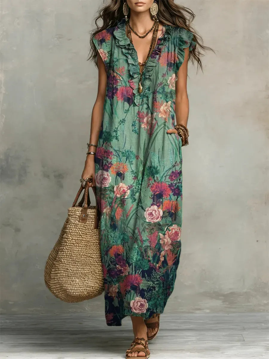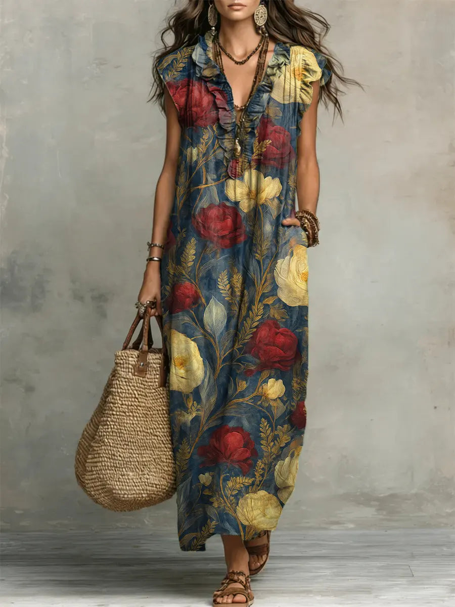 Women's Retro Floral Pattern Art Print Casual Ruffled Stylish Cotton Linen Dress
